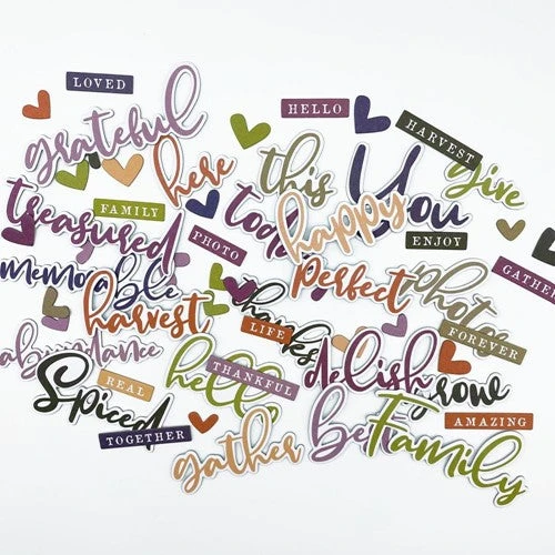 56 pieces of thin non-adhesive backed chipboard shapes. This set includes various word titles, word strips and hearts. These pieces can be added to all your crafting projects.
