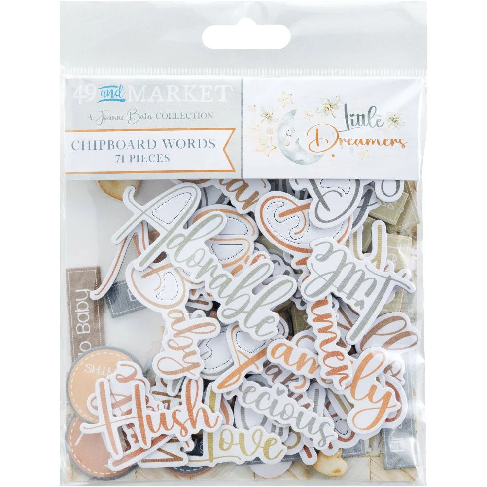 Celebrate every precious moment with 49 and Market’s Little Dreamers Chipboard Words. This set includes 71 die-cut chipboard pieces designed to highlight each month of baby’s first year, mark milestones, and add charming baby-themed accents to your projects. Featuring sweet words, hearts, and stars, these pieces are perfect for enhancing scrapbook layouts, baby albums, and handmade cards with a whimsical, heartfelt touch.