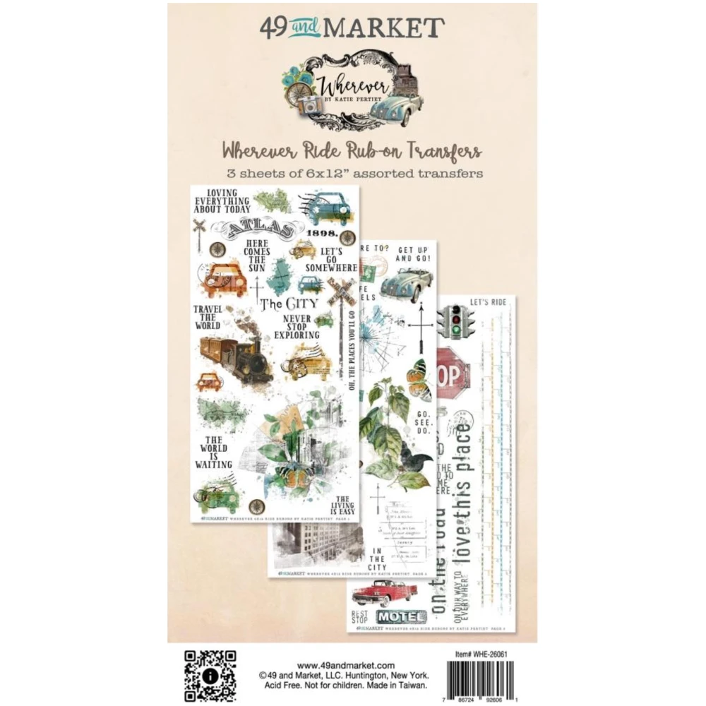 This versatile sheet offers a vast assortment of vintage designs, travel icons, quotes, and distressed elements. With three 6 x 12 inch sheets of assorted transfers, elevate your projects effortlessly. Get creative with the Wherever Ride Rub On Transfer Sheet today!
