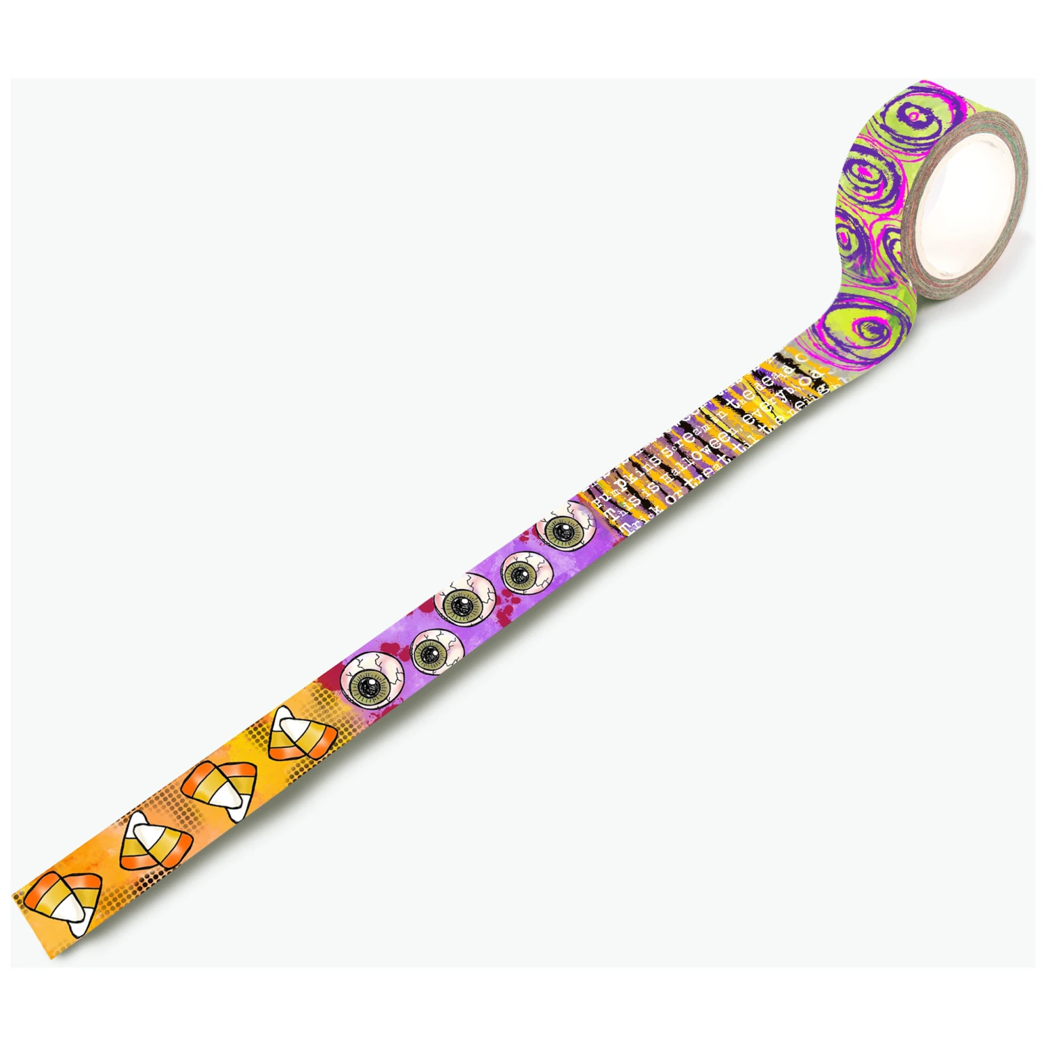The AALL & Create Booooo! Washi Tape, designed by Janet Klein, boasts a width of 20mm (0.79 inches) and an ample length of 10 meters. This colorful wash tape is adorned with whimsical Halloween-themed designs, including candy corn, eyeballs, squiggles, and lyrics from “The Nightmare Before Christmas”: