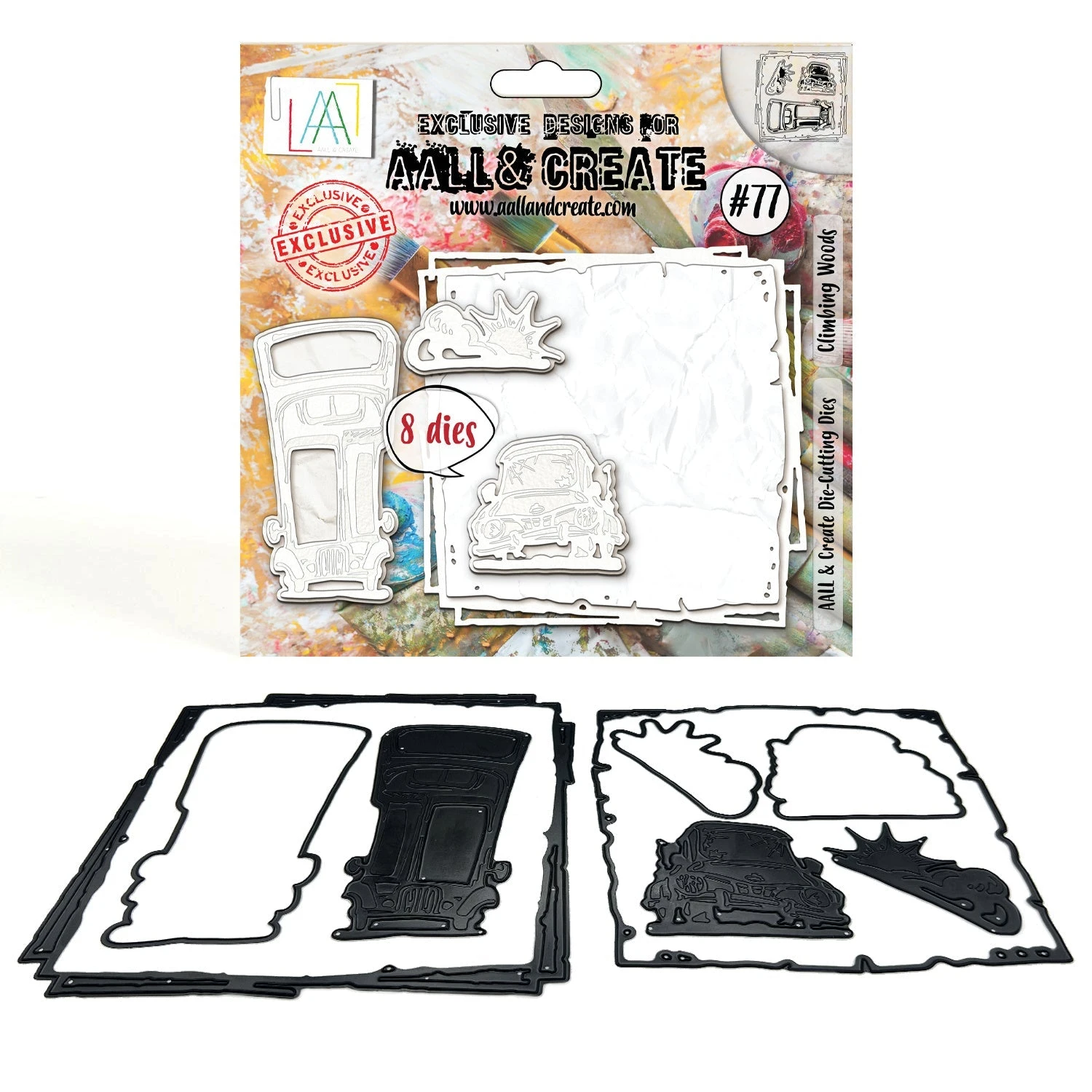 The AALL & Create Climbing Woods Die Set, designed by Autour De Mwa & Co., includes 8 deeply etched dies. The largest die measures approximately 5.8 x 5.7 inches, while the smallest measures about 2.2 x 1.2 inches. This set includes two square dies with jagged, uneven edges for dynamic framing, along with scene-building elements such as a cloud with a sun, a whimsical double-decker bus, and a car. Perfect for creating imaginative landscapes, this set adds character and depth to any project.