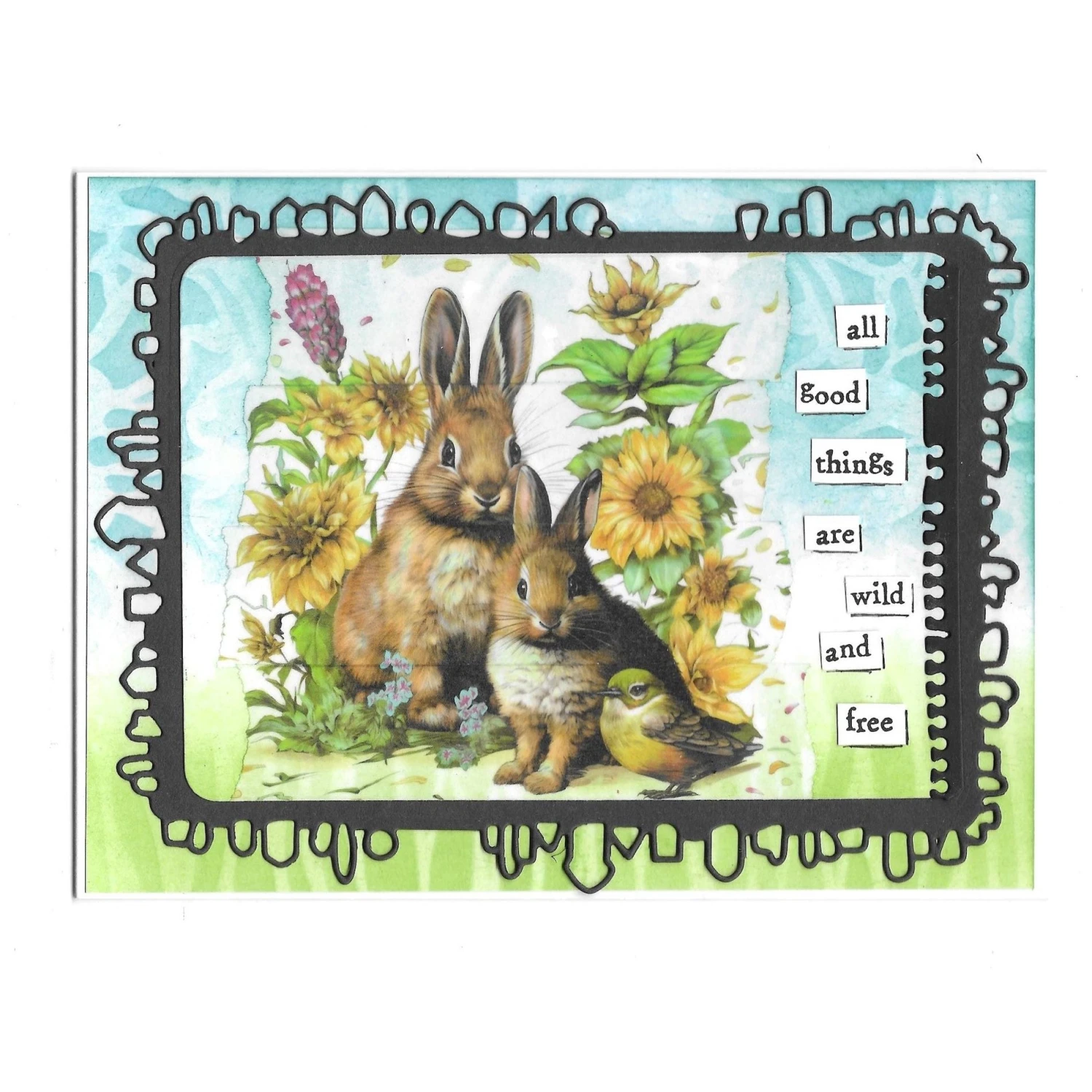 The AALL & Create Sunflower & Hare Washi Tape, part of the Layer it Up Collection, measures approximately 1 inch x 10 meters. This tape features cute little bunnies sitting with their bird friend amidst a backdrop of wildflowers, with petals falling gently, creating a charming scene perfect for adding a whimsical touch to your projects.
