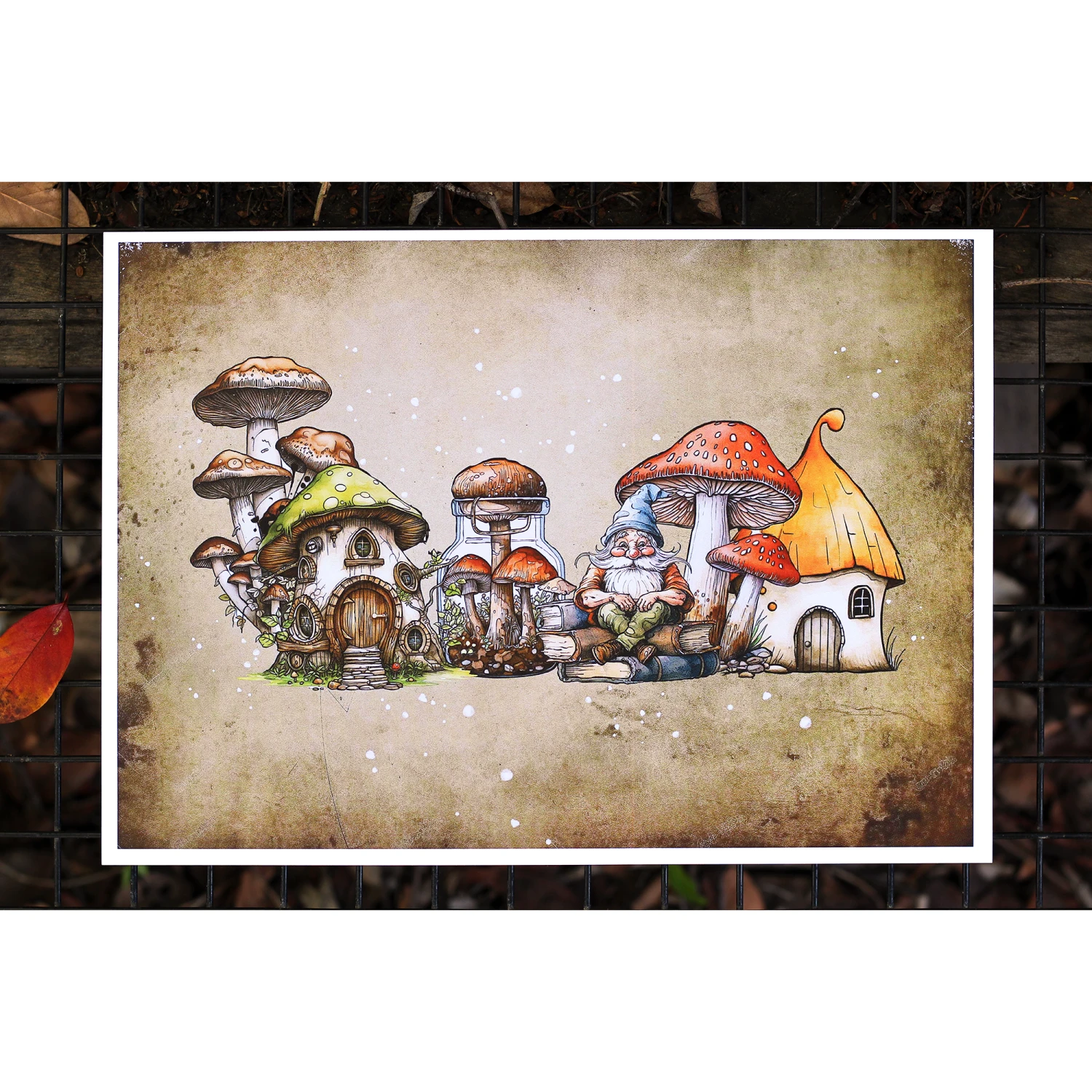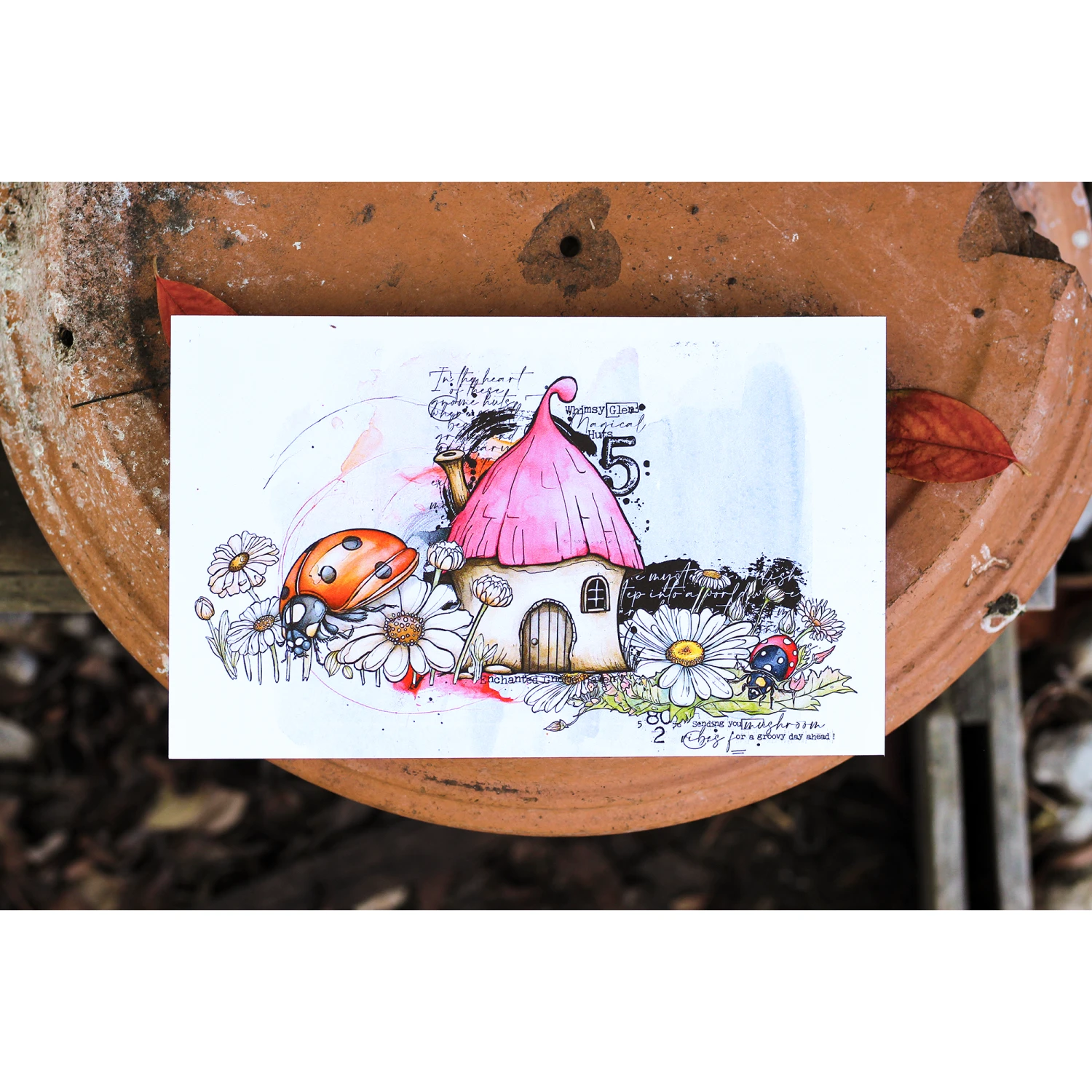 AALL & Create Whimsical Haven A7 Clear Stamps, part of the Enchanted Meadows Collection by Bipasha Bk, offer a delightful addition to your crafting supplies. This 3×4-inch clear, etched photopolymer stamp set includes 1 piece. This collage piece showcases a charming thatched gnome house amidst a backdrop of script and splotchy numbers. The text “Enchanted Gnome Haven” adds an enchanting touch to this whimsical scene.