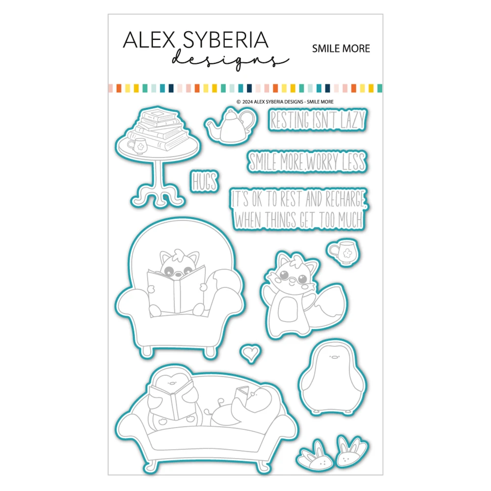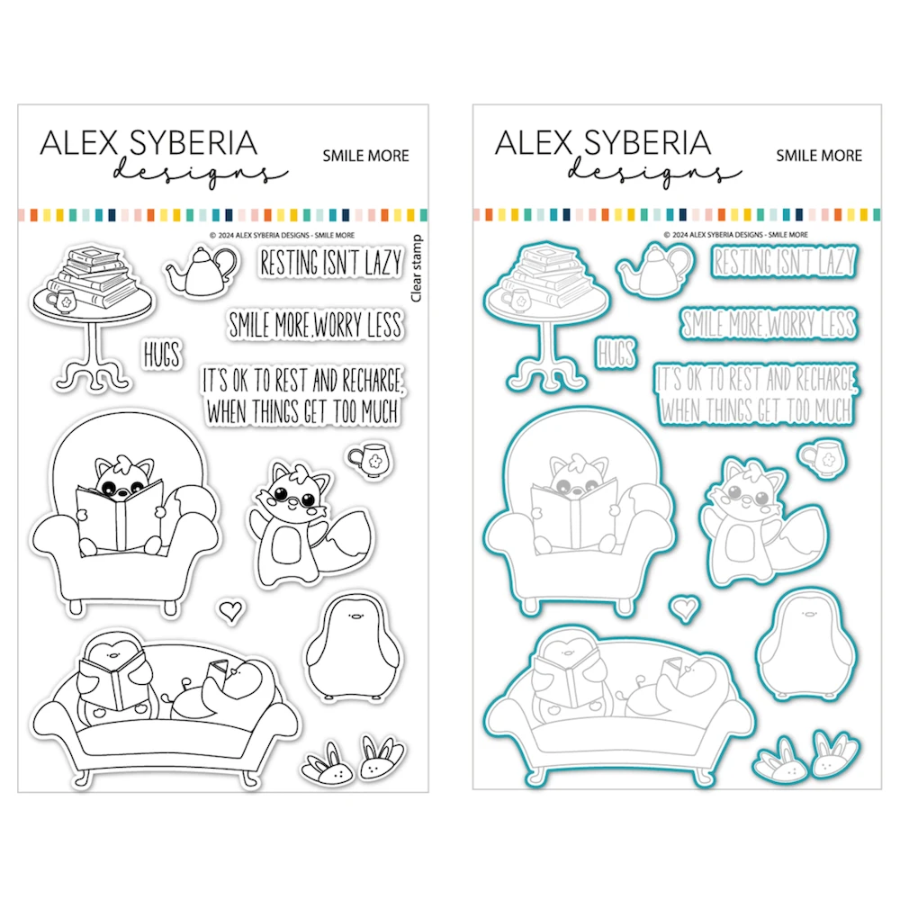 Spread positivity with the Alex Syberia Designs Smile More Stamp and Die Bundle. The 4 x 6 inch Smile More Clear Stamp Set features charming kawaii-style foxes and penguins in cozy, uplifting scenes. This set is paired with heartwarming sentiments like,