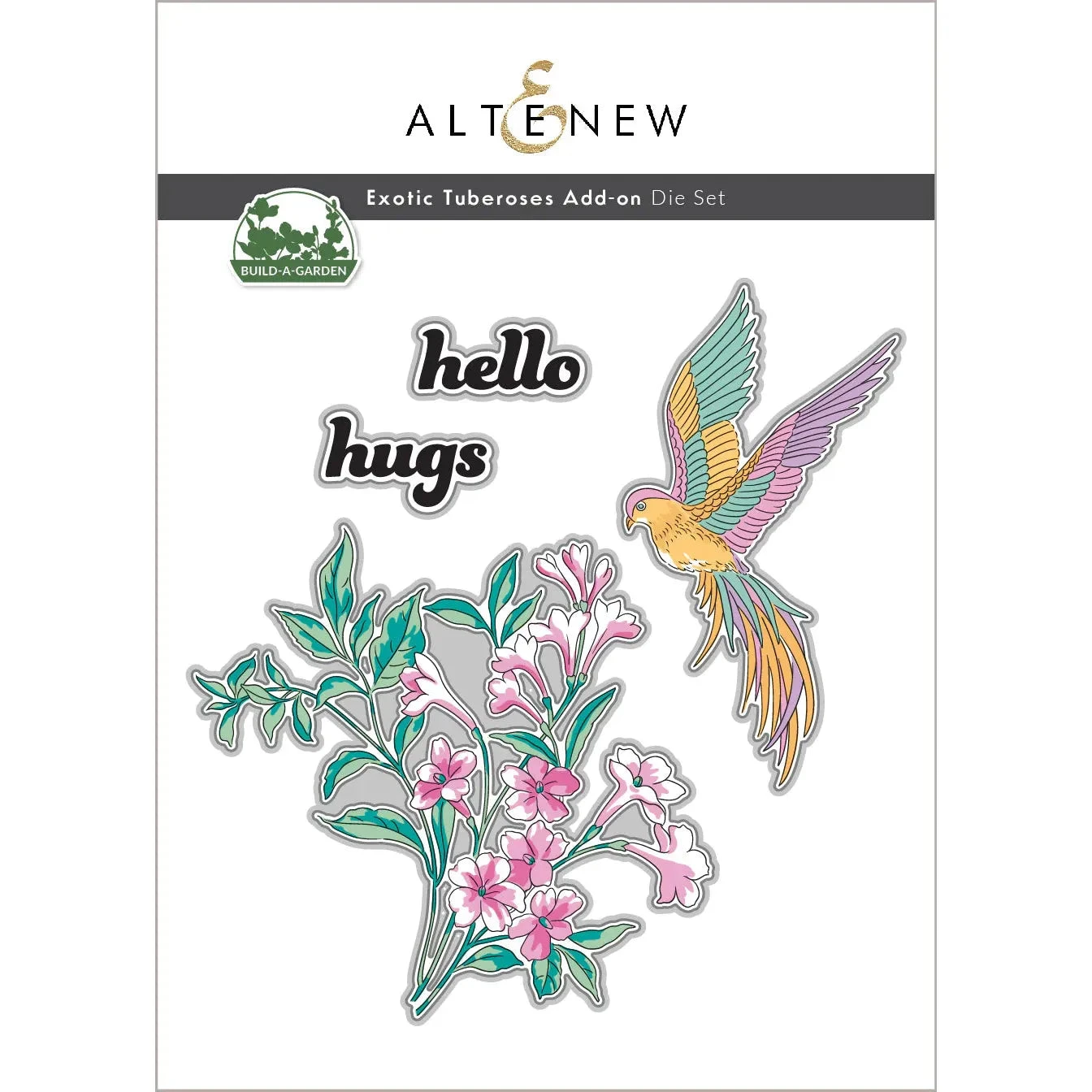 Designed to coordinate with the Build-A-Garden: Exotic Tuberoses Stamp Set, this set includes dies to cut out the intricate flower arrangement and a charming bird motif. Additionally, it features dies for two sentiments to add a personalized touch to your projects.
