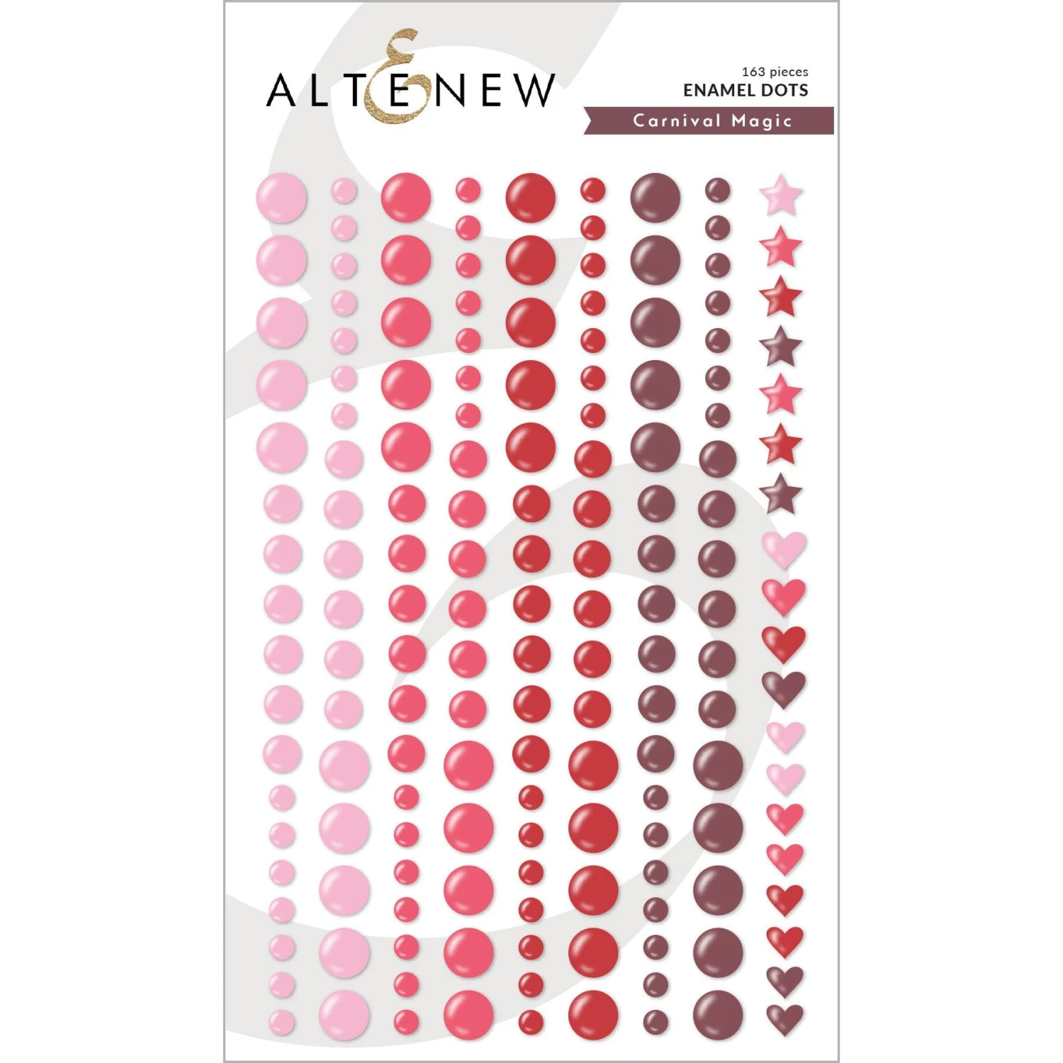 The Altenew Carnival Magic Enamel Dots are the perfect adhesive embellishments to coordinate with the Carnival Magic Fresh Dye Ink Set. These versatile dots are ideal for adding a decorative touch to your photos, planners, journals, scrapbooking, or card-making projects. The package includes 163 enamel stickers, featuring 144 dots in three different sizes, along with seven stars and twelve hearts, all in four vibrant colors.
