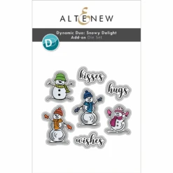 Complete your Dynamic Duo: Snowy Delight collection with the coordinating Dynamic Duo: Snowy Delight Add-On Die Set. This set perfectly complements the coordinating stamp set by cutting out the four adorable snowmen and the sentiment words wishes, kisses, and hugs.