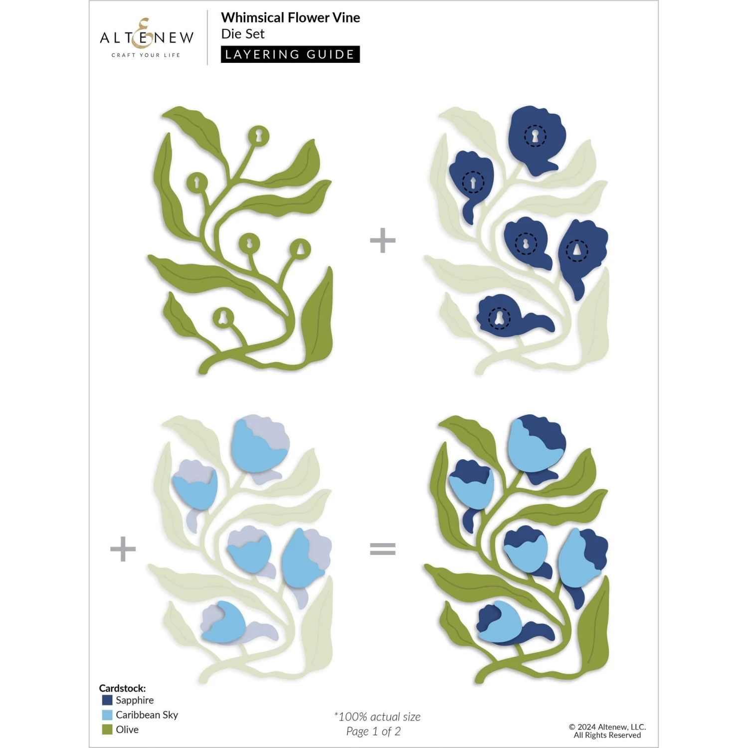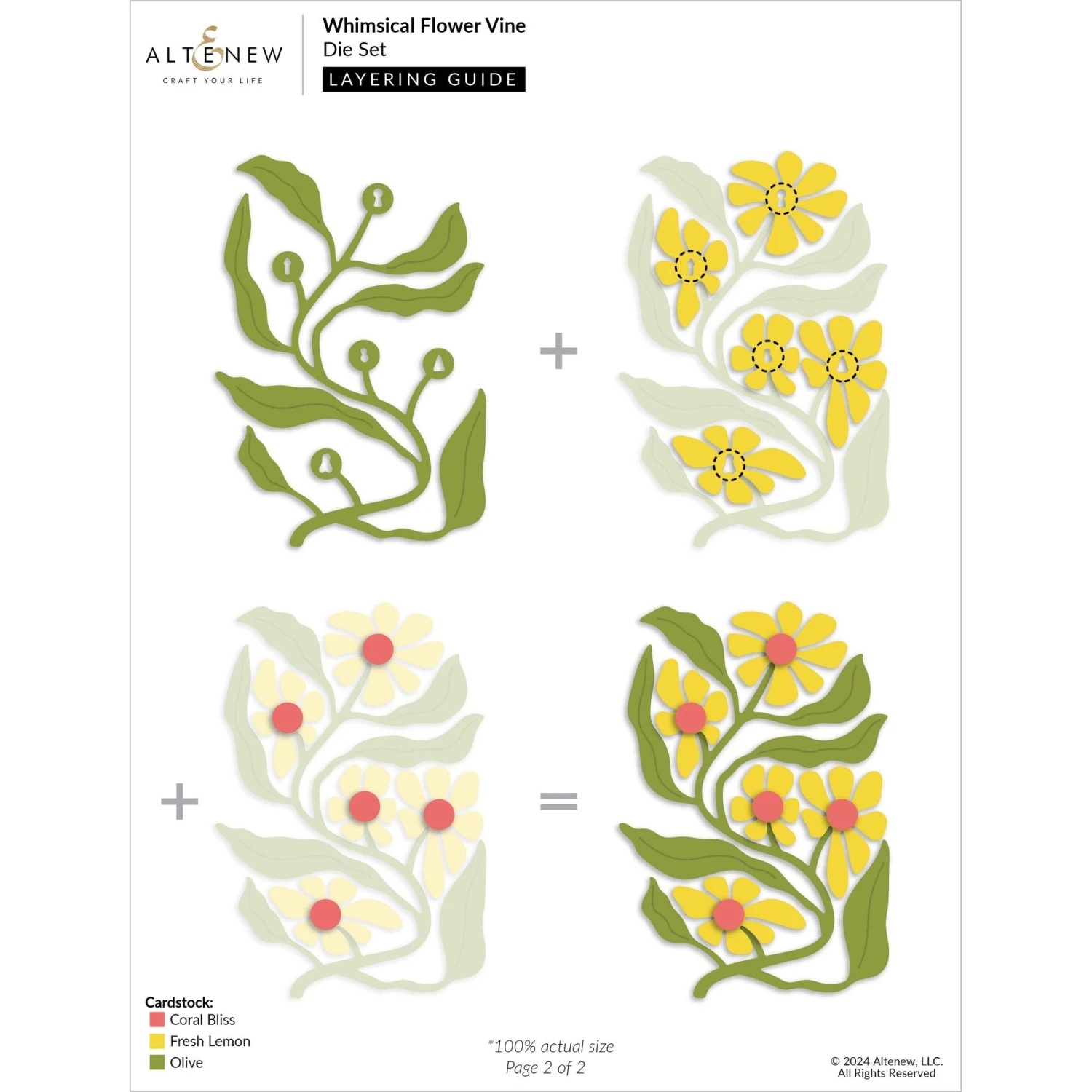 The Whimsical Flower Vine Die Set includes a leafy branch along with five buds. It features two sets of flowers complete with Altenew’s Key-Hole Alignment System. You can mix and match the flowers, use one set, or leave the branch with just the buds. The possibilities are endless!
