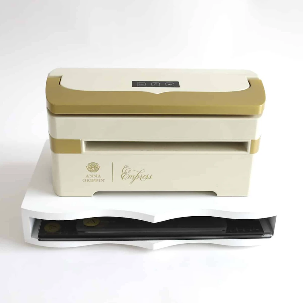 The Anna Griffin Craft Lazy Susan adds elegance and convenience to your crafting sessions. Designed for the Empress or Empress Elite Machine, this turntable features a gold swivel base for smooth rotation and built-in storage for your plate system. Dimensions: 15 x 10.75 x 2.6 inches.