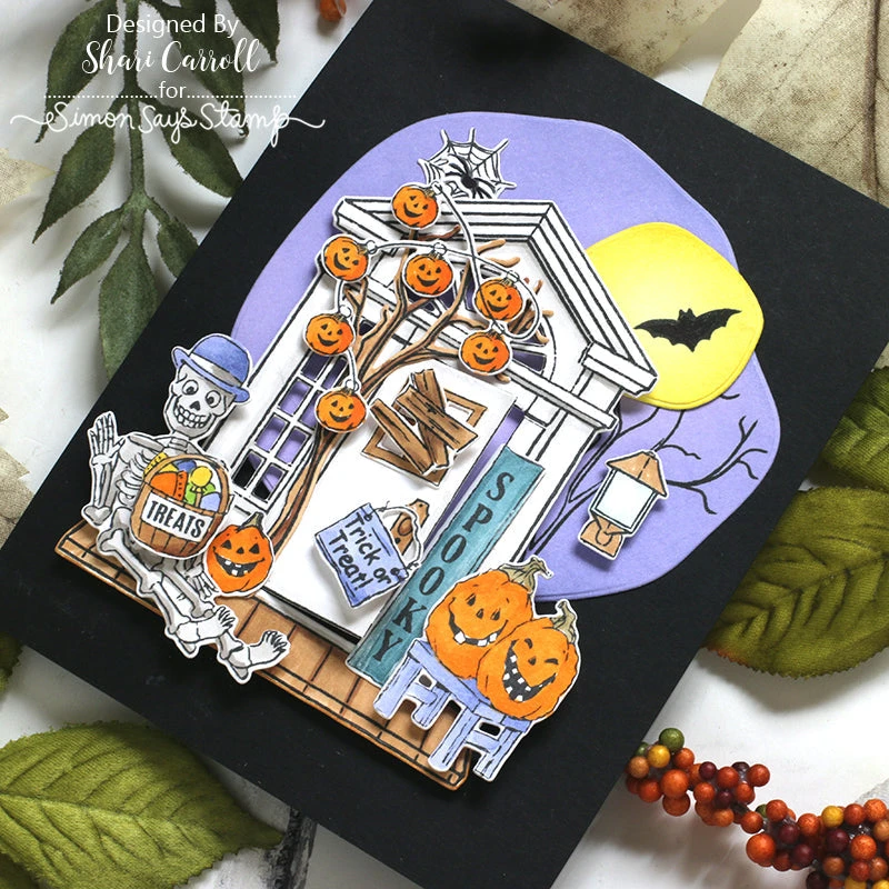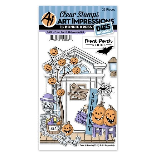 Continuing this awesome series from the creative mind of artist Bonnie Krebs! Ai Front Porch Sets are an innovative way to showcase your holiday themed doorways. Accessorize your Front Porch Door Set (sold separately) with this sweet Halloween porch set! Layer, pop-out, or mix and match for endless combinations! Door opens to reveal inside of card. Photopolymer clear stamp and die sets. Great for coloring with Tombow, Copic markers, or watercolor!