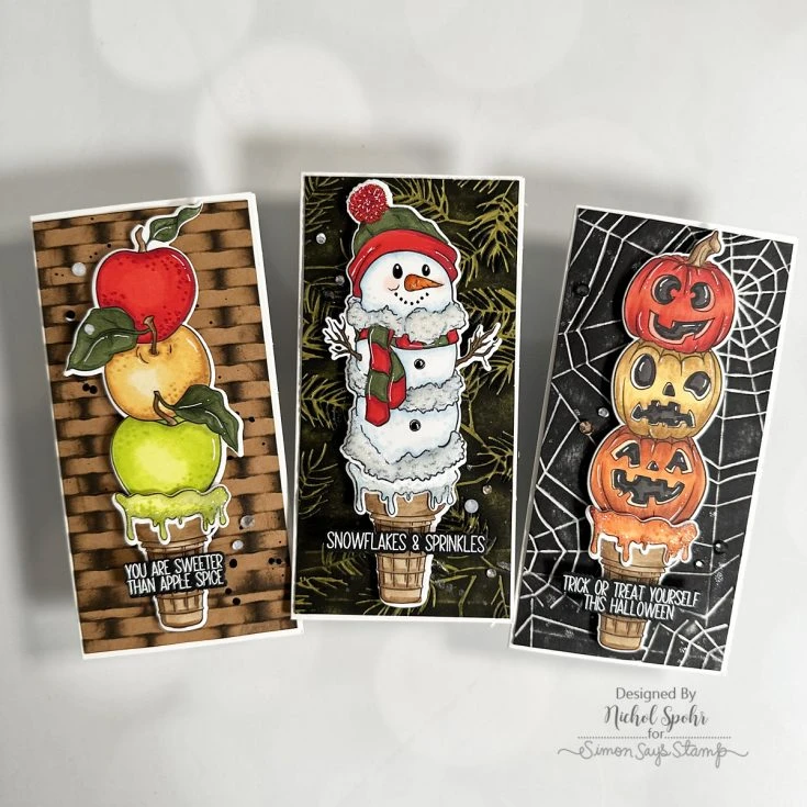This versatile set celebrates many seasons, starting with a playful sugar cone base that can be paired with a trio of stacked apples, a whimsical tower of jack-o’-lanterns, or an adorable snowman. Each image can be used with the cone or on its own for endless creative options.