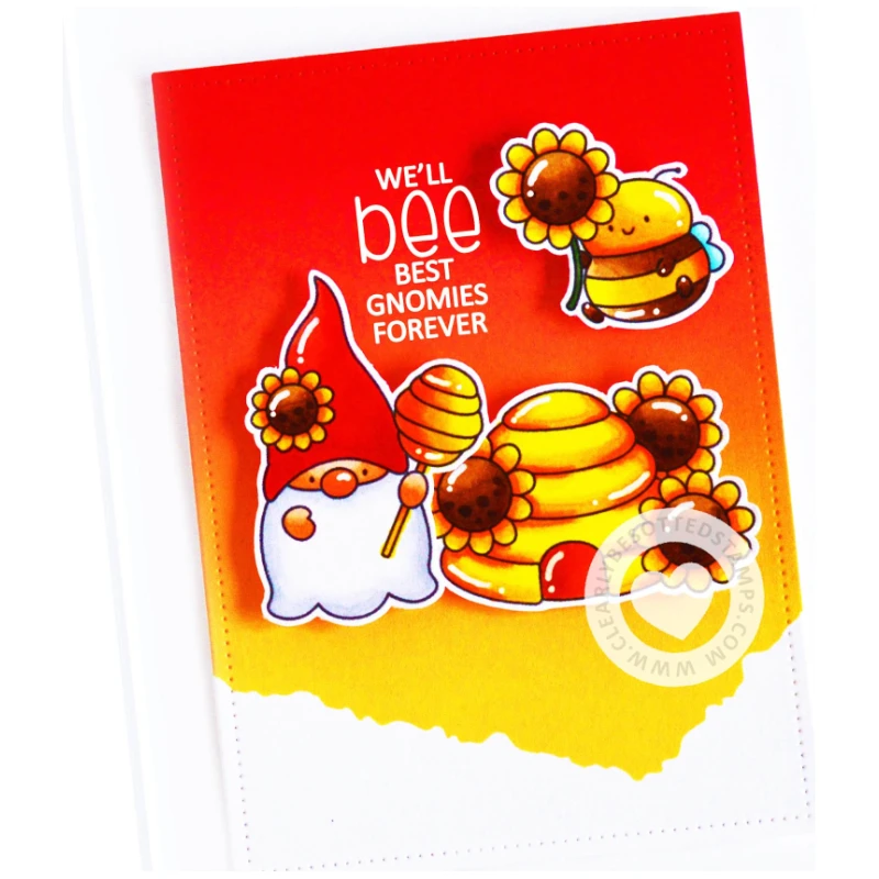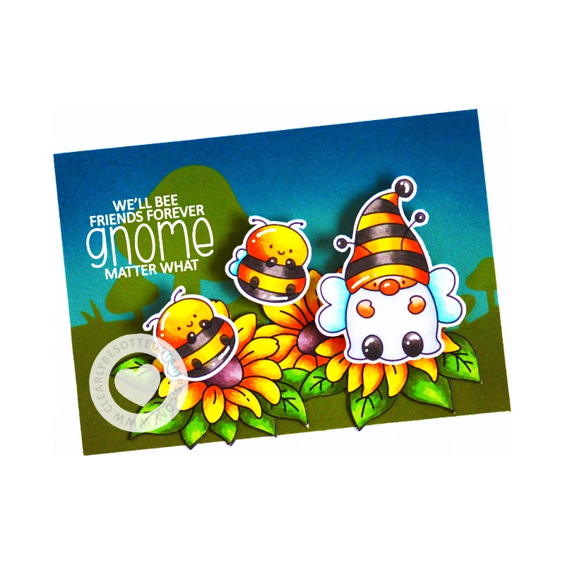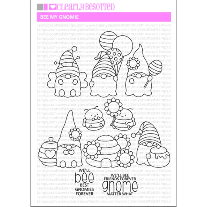 The Clearly Besotted Bee My Gnomie Clear Stamps is a charming 4×6 inch clear stamp set that includes 5 adorable gnomes, a bee hive, two bumblebees, and various sentiments. This set allows you to create delightful and whimsical scenes featuring these cute gnomes and their bee friends. Whether you’re crafting cards, scrapbooking, or creating other paper projects, this stamp set adds a touch of sweetness and charm to your creations.