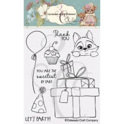 Colorado Craft Company Kris Lauren Sweetest By Far Clear Stamps: Get the party started with the Sweetest By Far Clear Photopolymer Stamp Set featuring the delightful illustrations of Kris Lauren for Colorado Craft Company. This set includes clear photopolymer stamps depicting a stack of presents, a balloon, a party hat, a cupcake, and a fox.