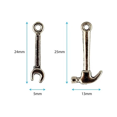 A set of 12 silver metal charms, hammers and spanners.