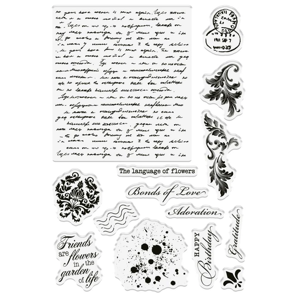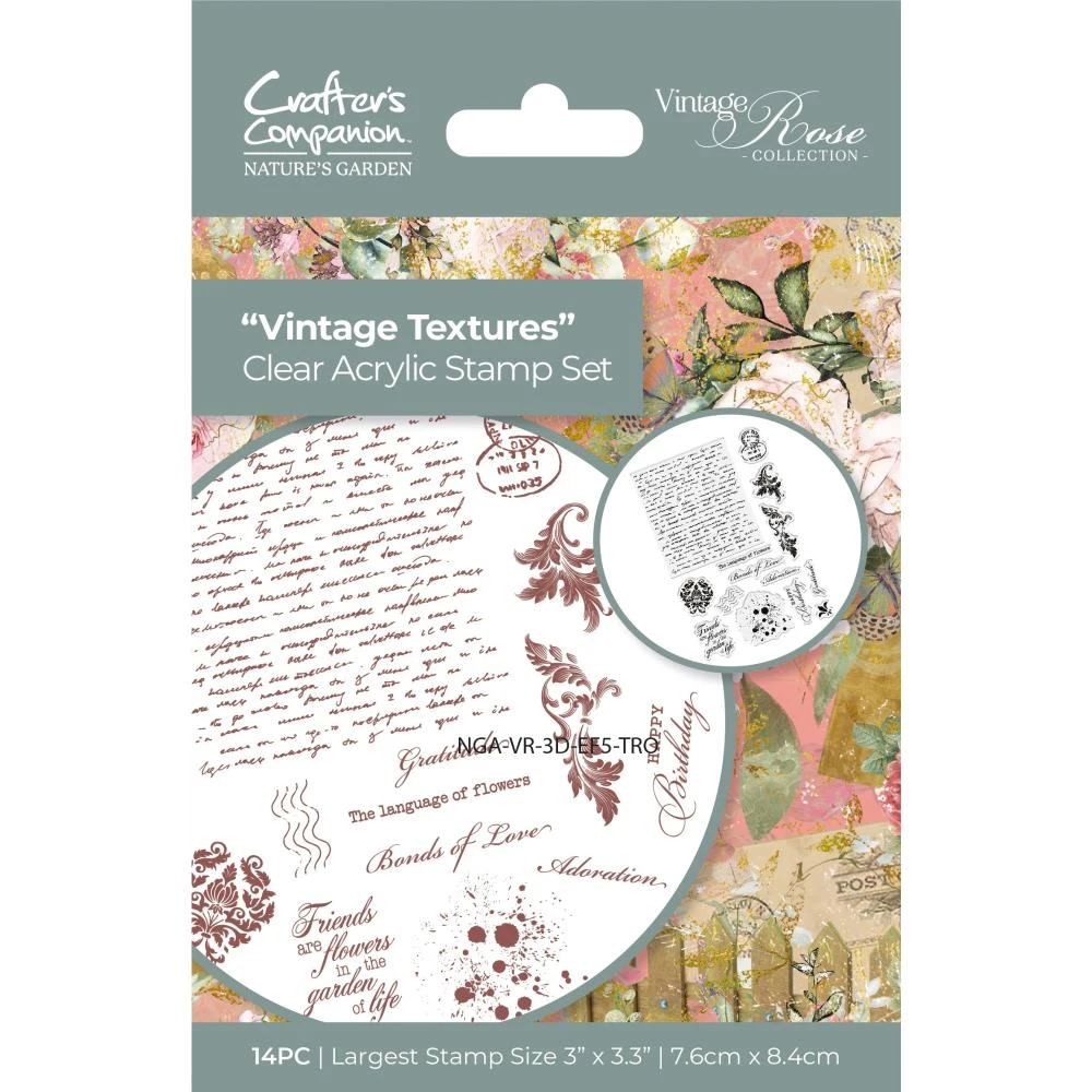 This Vintage Textures stamp set from Crafter’s Companion Nature’s Garden features 14 clear acrylic stamps to create a variety of vintage effects, illustrations, and messages. Achieve a classic look with postmarks, inkblots, and special messages for finishing touches. Largest stamp size measures 3 x 3.3 inches (7.6 x 8.4cm).