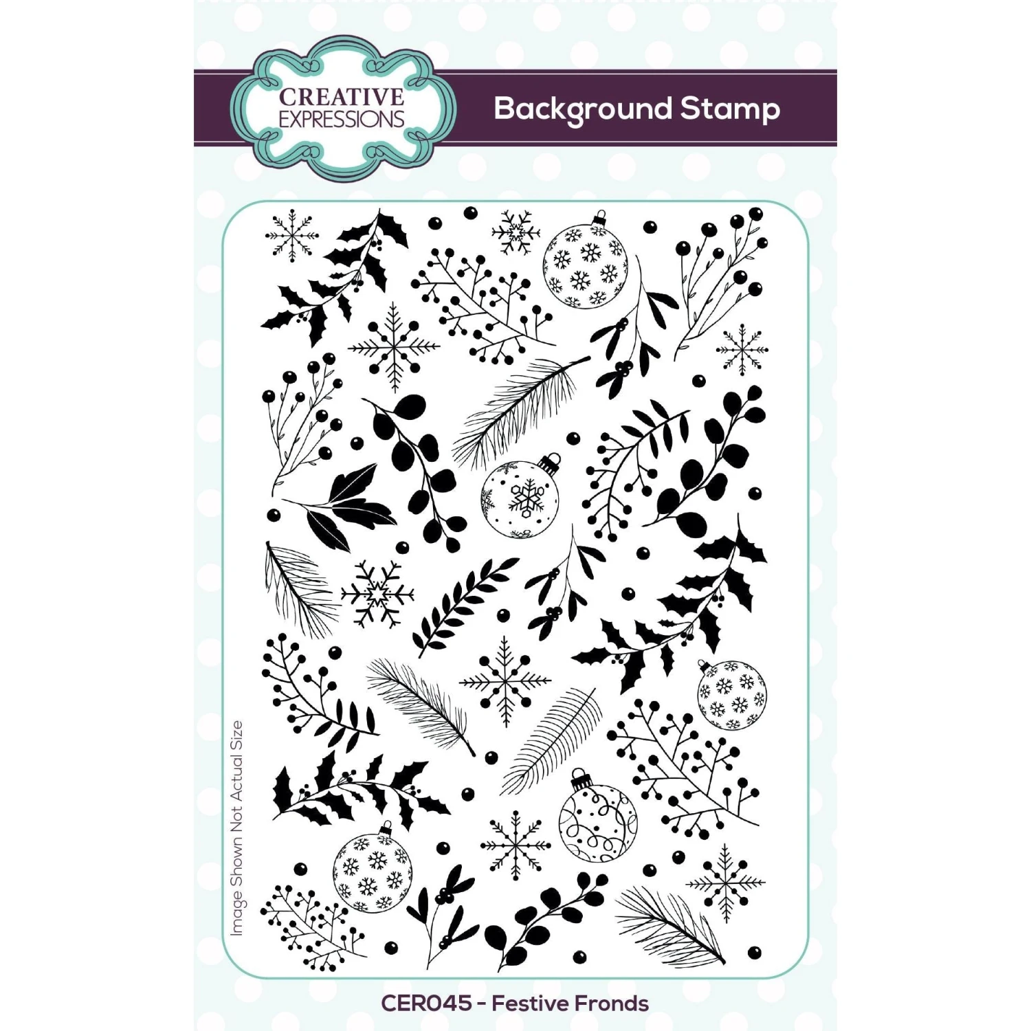 Create great backgrounds for your festive projects easily with Festive Fronds. This close-cut rubber stamp will deliver clean, intricate designs on porous and non-porous surfaces when combined with the stamping medium of your choice. These stamps are sized to deliver swift coverage to projects both large and small, making them suitable for cards or larger creations. The stamp can be used for cards, journals, gift-wrapping paper and so much more. High-quality grey rubber stamp. Ready to mount on an acrylic block the stamps can be used with ink pads, paint, or used with pigment and embossing powder. They are suitable for paper fabric, or any other surface depending on the ink choice. 4 x 6 inch cling stamp set includes 1 stamp. This stamp features a variety of holiday imagery to make a festive background. It includes. Pine sprigs, ornaments, holly, berries, snowflakes and fronds.