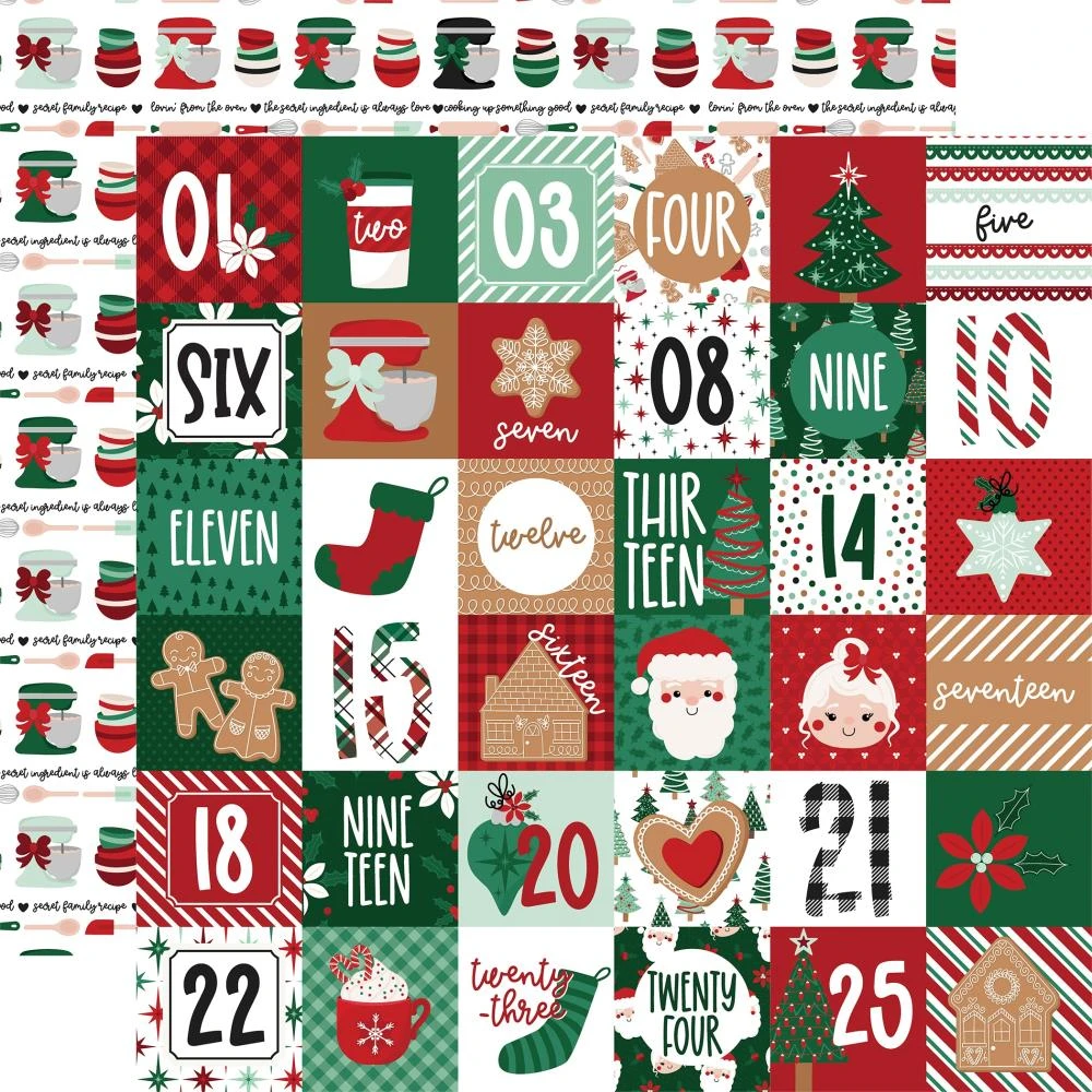 Enhance your creative endeavors with the ideal paper for scrapbook pages, greeting cards, bookmarks, gift cards, mixed media, and more. This package consists of a collection kit containing 12 double-sided 12×12 inch 65lb. patterned papers and one sheet of 12×12 inch cardstock stickers. The imagery features gingerbread cookies, candy canes and peppermints, snowflakes, aprons, poinsettias, Santa Claus, mixers, and baking supplies in shades of red, green, black, and white.