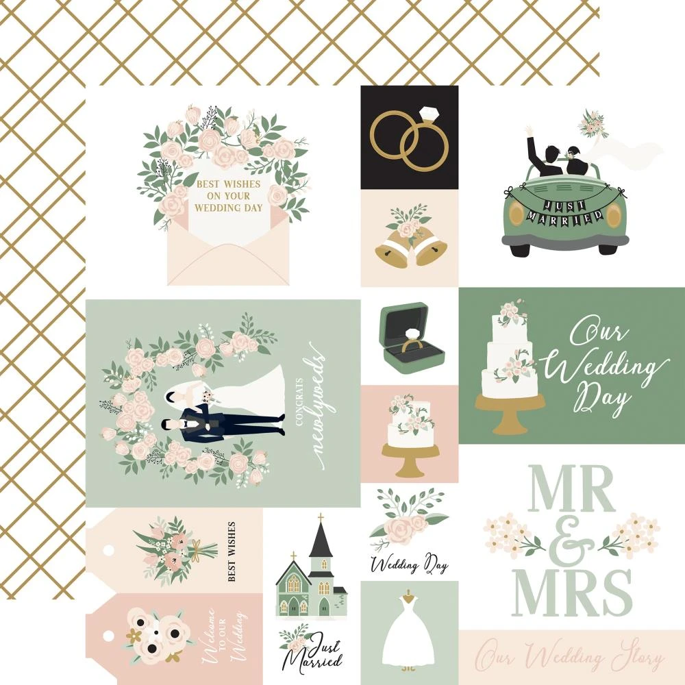 Begin your project with the ideal paper for scrapbook pages, greeting cards, bookmarks, gift cards, mixed media, and more! Included in this package is a collection kit featuring 12 double-sided 65lb. 12×12 inch patterned papers and one sheet of 12×12 inch cardstock stickers. Designs include wedding cakes, floral bouquets and sprigs, wedding bells, wedding gowns, and rings in shades of pink, green, gold, and white.