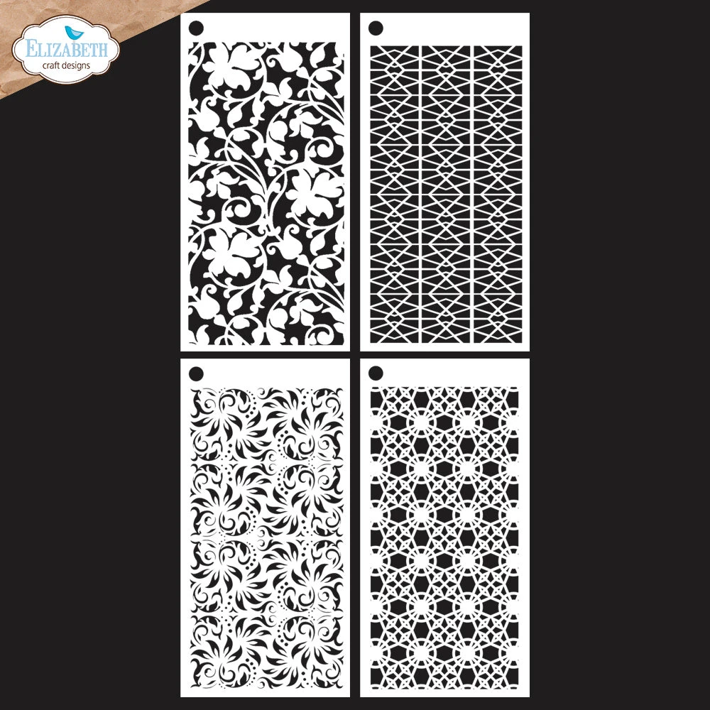 Elizabeth Craft Designs Journal Stencils are part of the Mr. & Mrs. Art Journal Specials Collection. This set includes 4 stencils, each measuring approximately 4.3 x 8.6 inches. The designs feature elegant vines of florals, intricate flourishes, and geometric patterns, perfect for adding beautiful details to your art journal projects.