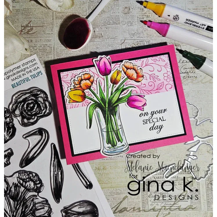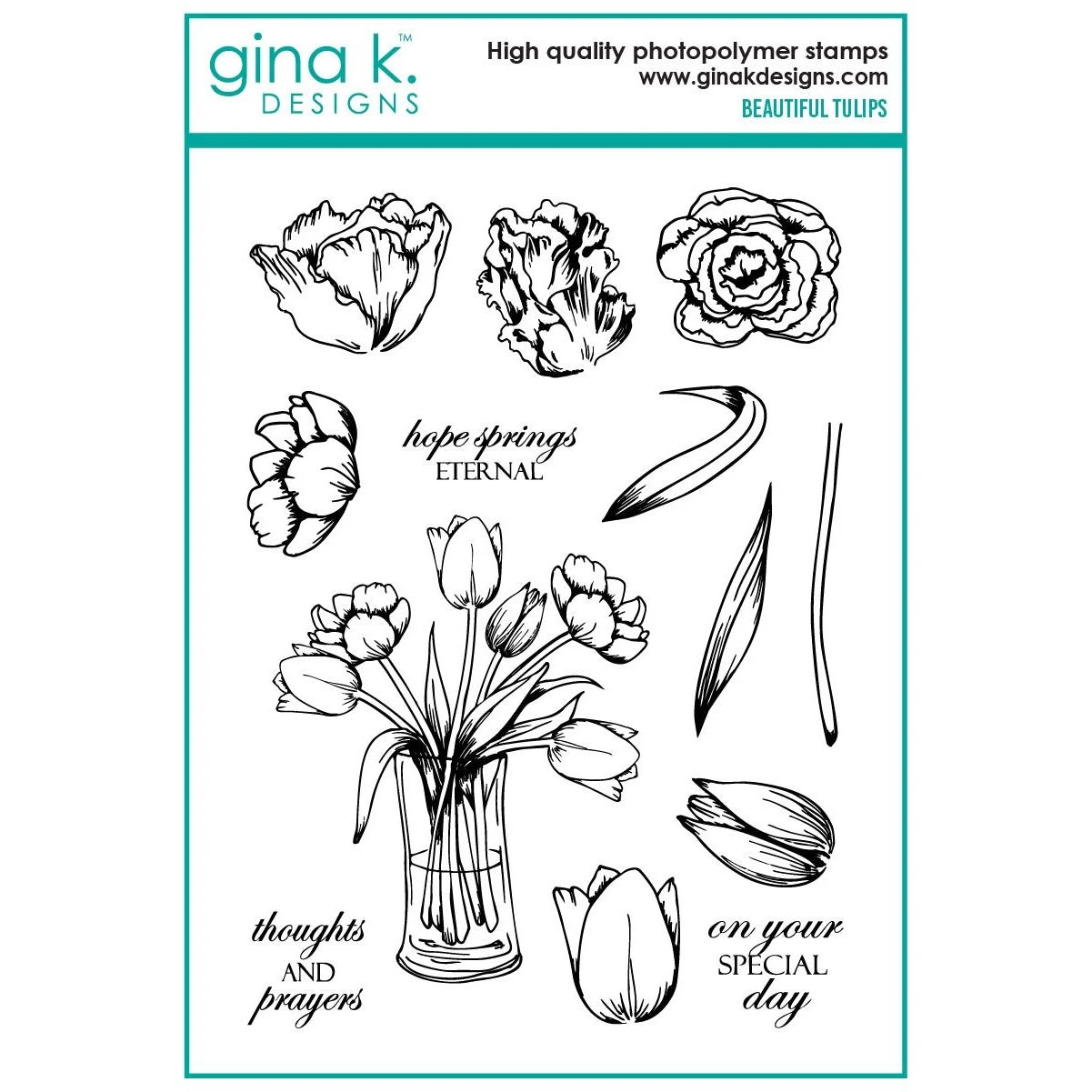Create elegant floral designs effortlessly with the Gina K Designs Beautiful Tulips Stamps. This 6×8 inch clear stamp set features a detailed bouquet of tulips in a vase, along with separate tulip stems, leaves, and blooms, allowing you to build layered, unique compositions. Included are three sentiments to complement your projects, making it ideal for cards, tags, scrapbook pages, and more. Perfect for adding a sophisticated touch to your crafting with precision and versatility. Sentiments included:
