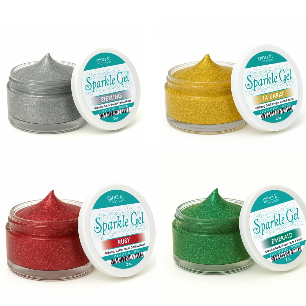 Add a festive sparkle to your creations with the Gina K Designs Holiday Sparkle Gels set! Featuring four dazzling shades—14 Karat, Sterling, Emerald, and Ruby—these 2 oz. gels are perfect for holiday crafting and beyond. Layer them over stencils or apply with a brush or spatula to add vibrant shimmer exactly where you want it. Let your projects shine bright and catch every eye with these playful sparkle gels!