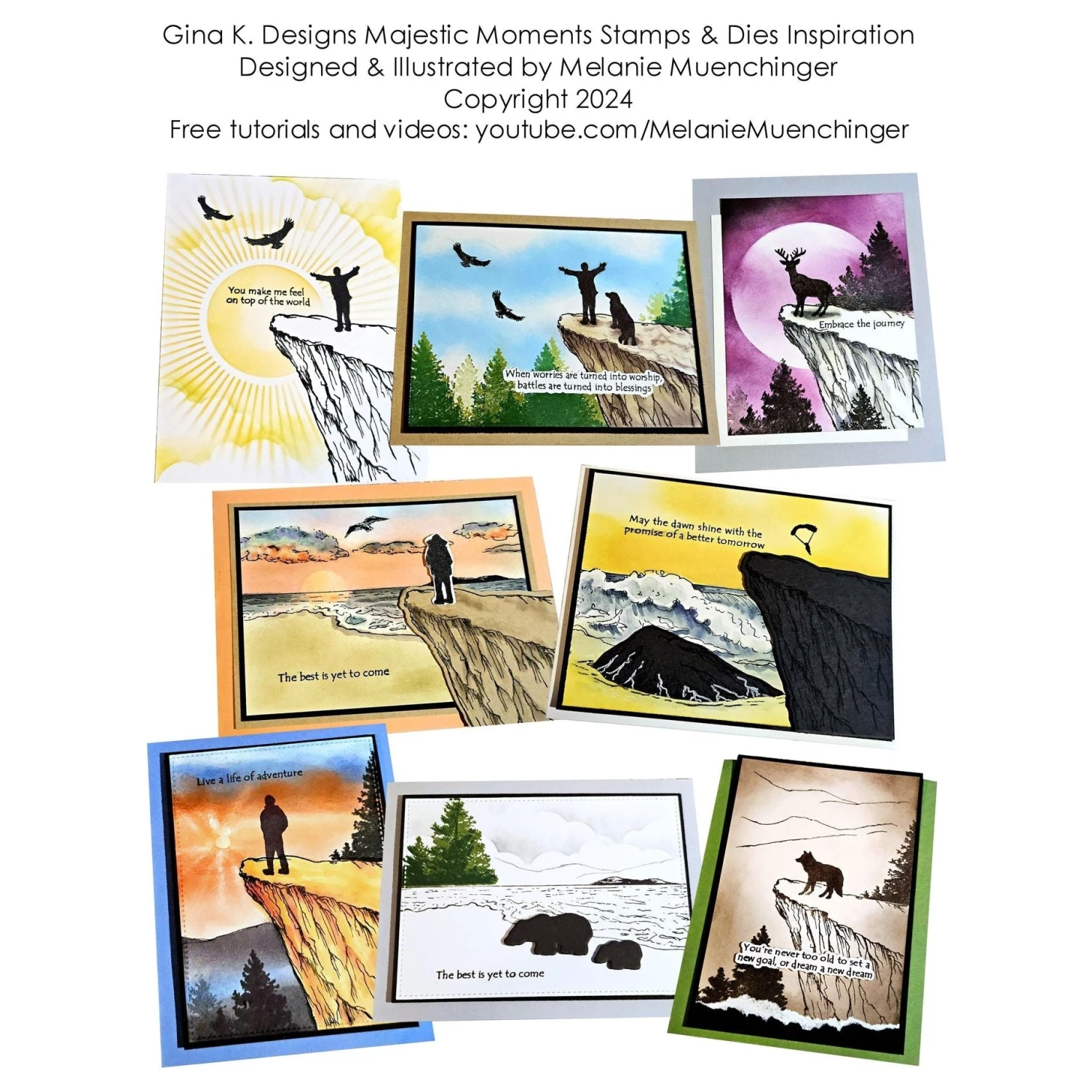 Explore the great outdoors and capture its majestic beauty with the Gina K Designs Majestic Moments Stamps! This 6×8 inch clear stamp set features stunning silhouette imagery of various animals and hikers, along with natural elements and encouraging sentiments. Perfect for creating breathtaking scenes and inspiring projects. Sentiments included: