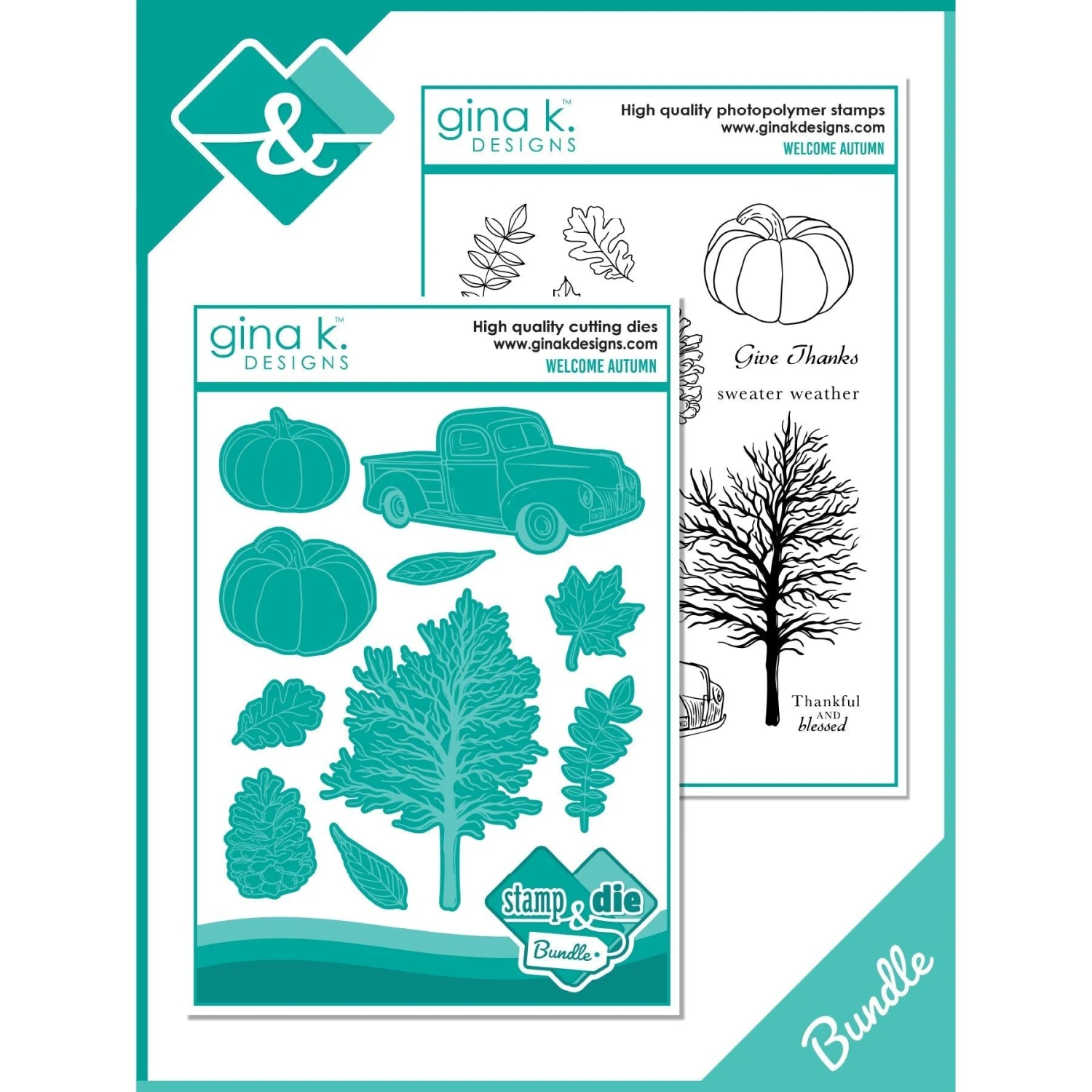 Embrace the arrival of Autumn with elegance and charm using Gina K Designs Welcome Autumn Stamps and Dies Bundle. This 15-piece 6×8 inch set features intricate foliage, a pine cone, pumpkins, a bare tree, and a vintage truck, accompanied by cozy sentiments. As a special bonus, this set also includes coordinating dies for the icons in the set for perfect results every time! Create stunning seasonal crafts with sophistication. Sentiments include: