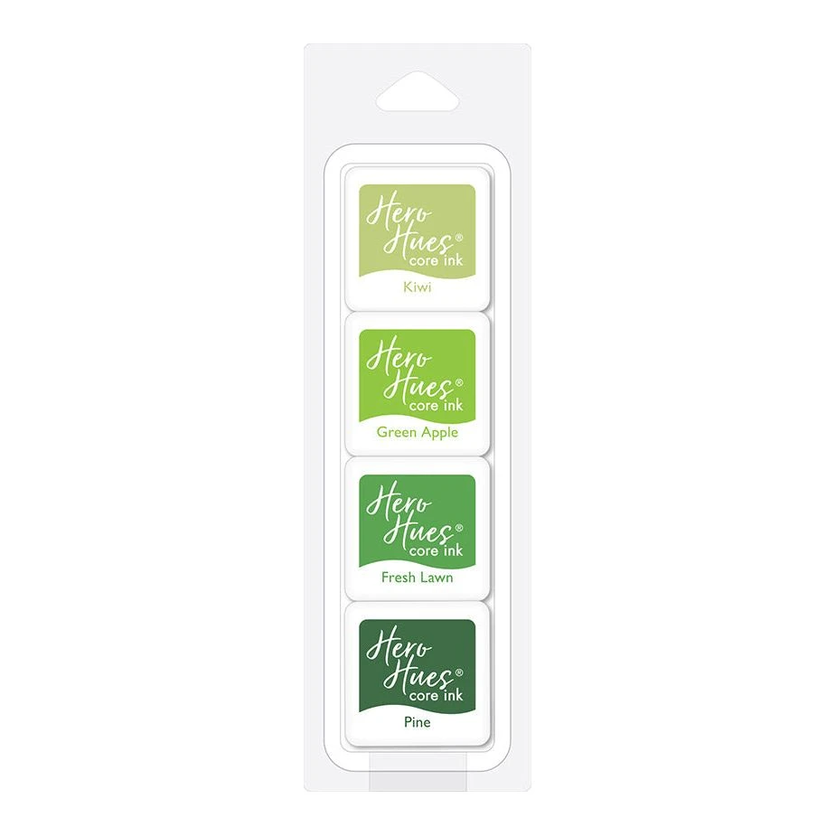 Introducing the Hero Arts Fresh Greens Core Ink Cubes – a delightful set of four 1.25 x 1.25 inch ink cubes, showcasing the charming colors of Kiwi, Green Apple, Fresh Lawn, and Pine inks.