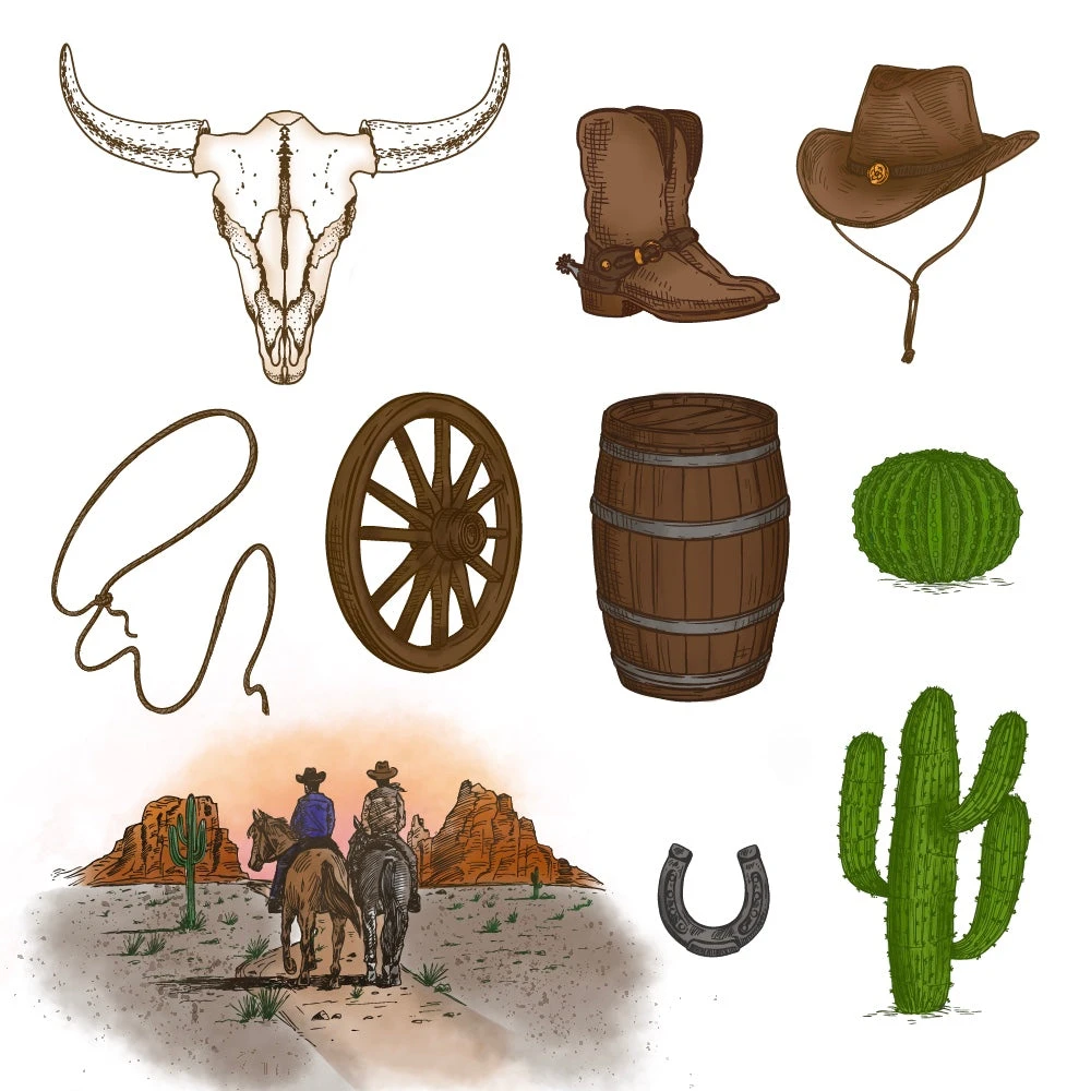 The Honey Bee On The Range Cling Stamps set features 10 rubber cling stamps on a 5 x 7-inch sheet, designed to bring the spirit of the wild west to your crafting projects. This collection includes detailed images like a cattle skull, cactus, cowboys, lasso, boots, barrel, hat, wagon wheel, and horseshoe, perfect for adding authentic western elements. Proudly made in the USA, these durable stamps deliver crisp, reliable impressions for cards, journals, and scrapbooks.