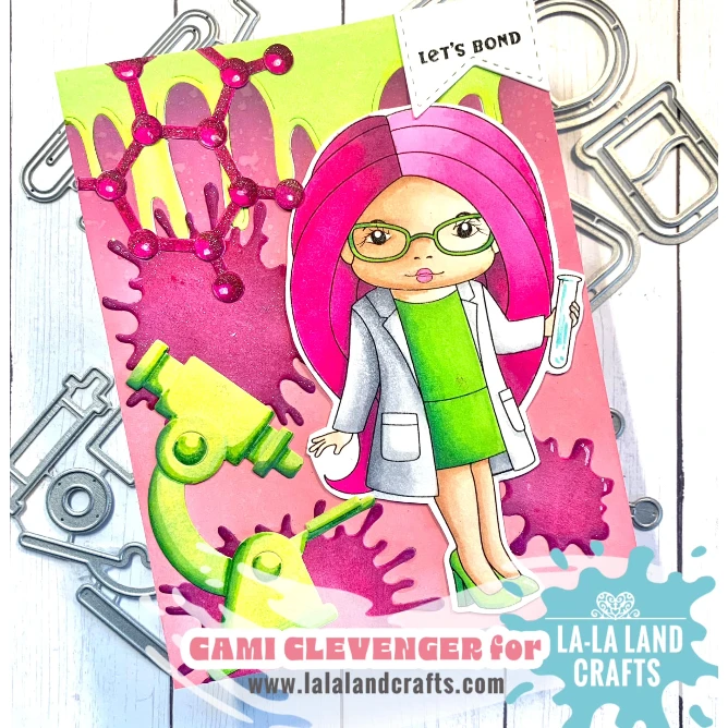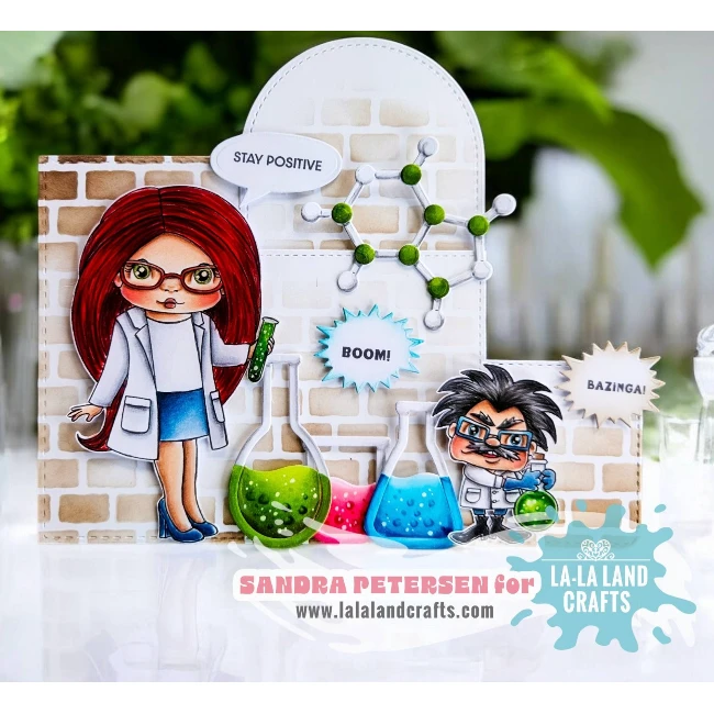 The La-La Land Crafts Scientist Marci Cling Stamp features an adorable image of Marci dressed for the lab in a lab coat, sweater, skirt, heels, and glasses, holding a beaker from her latest experiment. This charming stamp set also includes three coordinating sentiments, making it perfect for science-themed crafting projects.