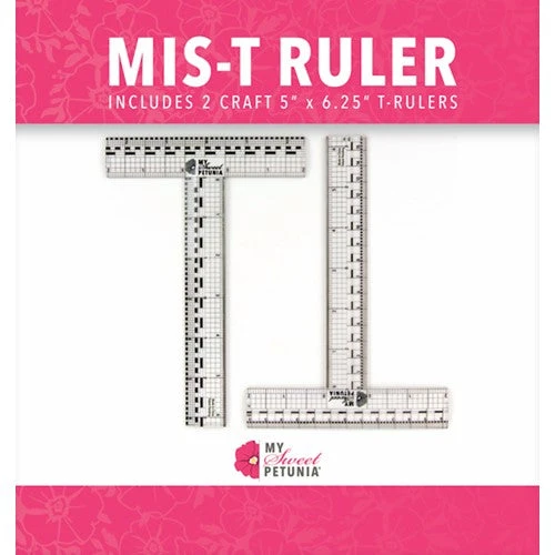 Designed and sized for papercrafters, the My Sweet Petunia Mis-T Ruler includes metric and imperial clear T rulers, with multiple units of measure, an inset steel ruler for cutting and a see through design that allows you to get perfect lines and cuts every time. Short side of the T-ruler is 5 inches, Long side is 6.25 inches