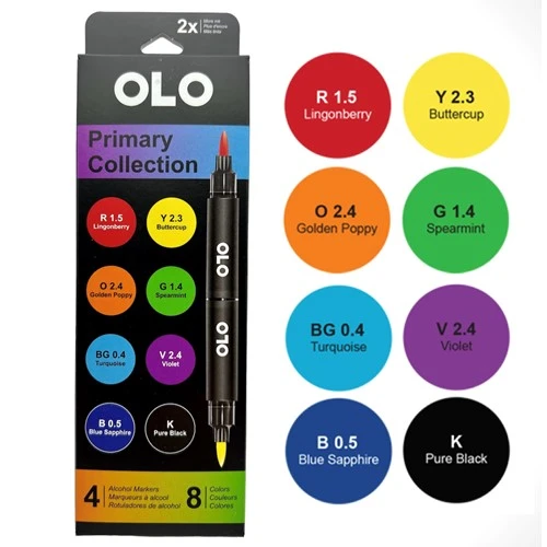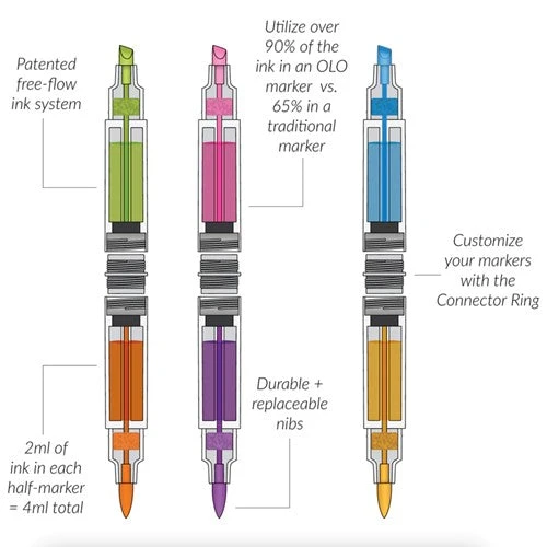OLO 4 piece set includes eight colored half-markers that twist together to form four markers. Traditional markers only have approximately 2ml of ink total. OLO’s patented free-flow ink technology uses over 90% of the ink compared to standard marker technology, with only 65-70% ink usage.