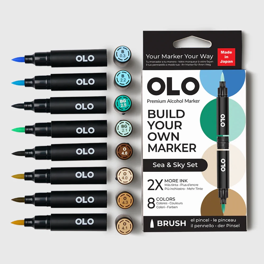 The OLO Sea & Sky Brush 8 Piece Marker Set features a calming blend of blues, aquas, and warm neutrals, ideal for illustrating seascapes, skies, and coastal scenes. This curated set includes 8 alcohol-based brush nib markers designed for serene, nature-inspired artwork.