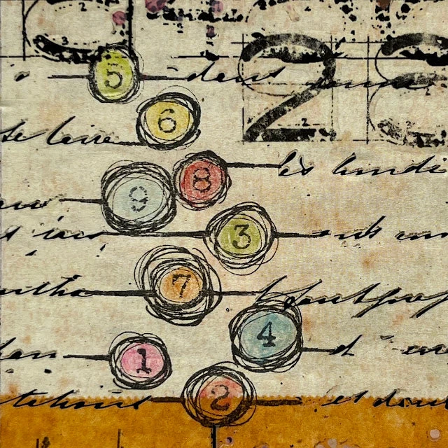 The Paper Artsy Eclectica3 Seth Apter Mini 73 Cling Stamp is a credit-card-sized rubber stamp, measuring approximately 3 x 2 inches. This particular stamp was designed by Seth Apter, a renowned artist known for his eclectic and mixed-media style. The stamp is versatile and suitable for various crafting projects, including card making, artist trading cards, inchies, and more. The stamp comes on EZ mount, which means it has a foam cushioning layer on the back. To use the stamp, peel it off the index sheet and position it onto an acrylic block. The stamp design consists of several horizontal lines, each adorned with circles and numbers. These elements create a unique pattern that can be used to add texture, borders, or decorative accents to your projects. The circles and numbers can be inked or colored in various ways to achieve different effects and create personalized designs.