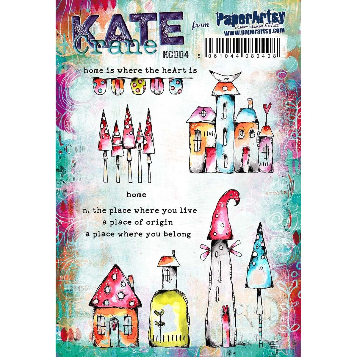 Paper Artsy Kate Crane Cling Stamps are multi-layered, loaded with explorative marks and easily identified by her whimsical elements. Crafted from deep-etched red rubber, these stamps are precision-trimmed and foam-mounted for ease of use. This collection comprises 8 cling stamps on a 6 x 8-inch sheet. Designs range from a charming banner adorned with polka dot and striped flags, featuring the phrase “home is where the heArt is,” to a delightful cluster of 4 city townhomes complete with windows, doors, and a perched bird. Additionally, the set includes various quirky house shapes with unique designs, along with whimsical depictions of pointy trees and a single tree with a tall trunk. The collection is complemented by a definition of home: “The place where you live, a place of origin, a place where you belong.”