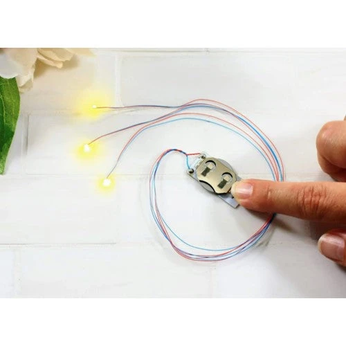 This package includes two light-up units with three warm white LEDs each, batteries included. These units have the lights already attached with long wires; no circuit building is required! To use, adhere the battery switch by glueing or taping the LEDs in place. Cover with decorative elements and mark ‘push’ over the button so the recipient knows how to turn the lights on. Must hold down the push button to display light.