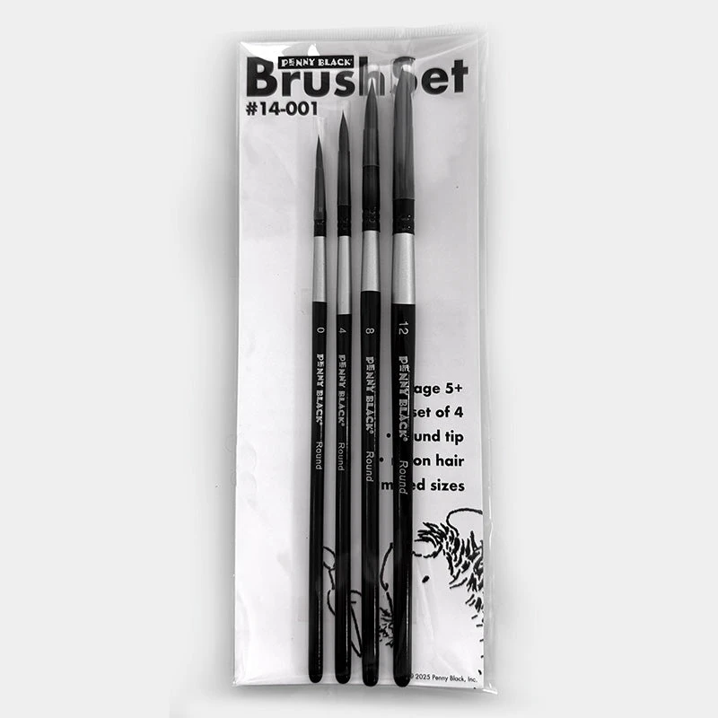 Penny Black Round Brush Set includes four nylon-bristle paint brushes with round tips in assorted sizes: 0, 4, 8, and 12. Designed for smooth application and control, these brushes are perfect companions to Penny Black’s Liquid Watercolors, sold separately.
