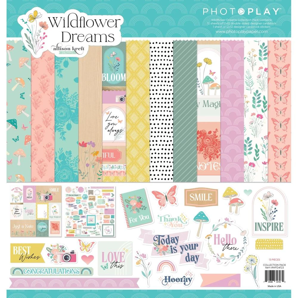 Step into a world of whimsy and positivity with Photoplay’s Wildflower Dreams Collection Pack. Featuring delicate hand-drawn botanicals, butterflies, and mushrooms, this pack is perfect for everyday events. With twelve double-sided 12×12 inch 65lb. cardstock sheets and a matching sticker sheet, unleash your creativity and spread good vibes with this acid and lignin-free collection designed by Allison Kreft. Made in the USA with a serene color palette of pink, purple, red, yellow, green, turquoise, brown, and grey.