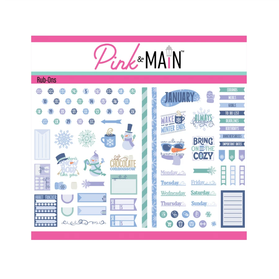 The Pink and Main January Rub Ons bring a frosty winter vibe to your planning with soft shades of blue, purple, and teal. This winter-themed set includes snowflakes, snowmen, mugs of cocoa, and cozy accents, along with handy icons for tracking habits, appointments, goals, and bills. Perfect for bullet journals, planners, and scrapbook spreads, these rub-ons help you stay organized and festive all month long. Each package includes two 6 x 8 inch sheets—just rub and go for quick, mess-free decoration!