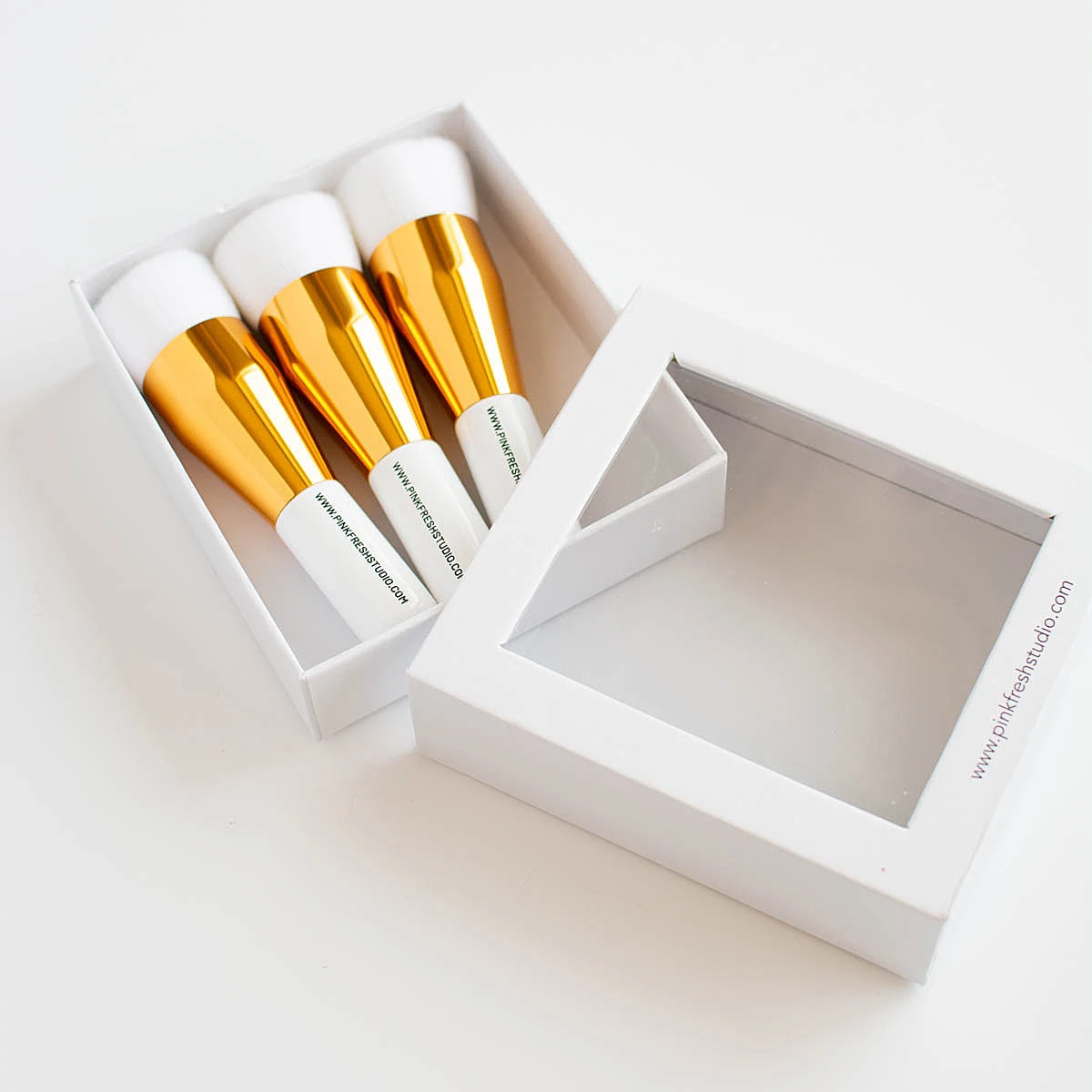 Introducing Pinkfresh Studio’s 1 Inch Blending Brush set – a must-have for any artist or crafter. This sleek and modern addition to the Studio Essentials collection offers a larger brush size, perfect for easily blending inks on larger surface areas. Each set includes (3) 1 inch blending brushes with a white lacquer handle, featuring the Pinkfresh Studio website in a clean black typeface, a gold ferrule, and high-quality vegan bristles. These brushes are ideal for effortlessly blending large stencils, creating layered backgrounds, and more. And for easy storage, each set comes in a high-quality white box with a peekaboo window and a ribbon pull to slide the brushes out. Compact and convenient, these brushes are perfect for on-the-go creativity and can easily fit into drawers, carts, and totes. Upgrade your blending game with Pinkfresh Studio!