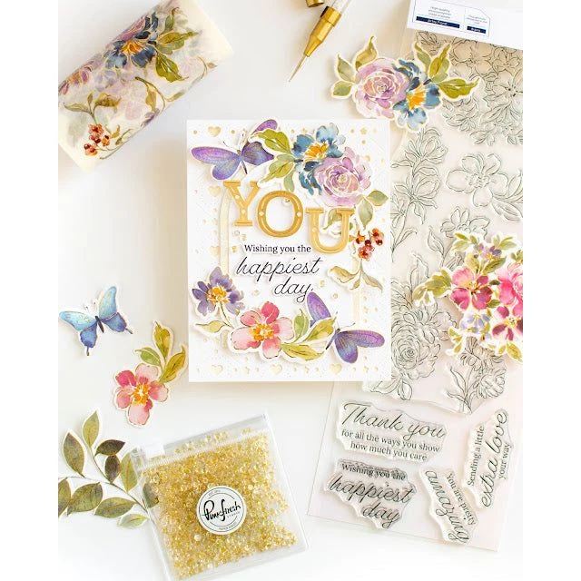 Effortlessly add beautiful watercolor florals to all your projects with Pinkfresh Studio’s Artsy Floral Washi Tape. Designed by Manushree Mishra, this 1 piece washi tape features a color palette of pinks, purples, and greens with a touch of blue, outlined in gold foiling for added shine. Coordinate with other Artsy Floral products for endless creativity. Roll size: 4 inches wide by 10 meters long.