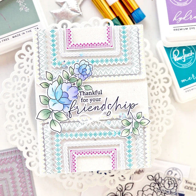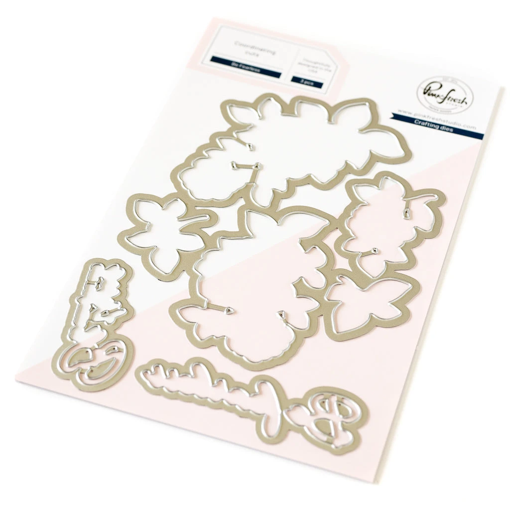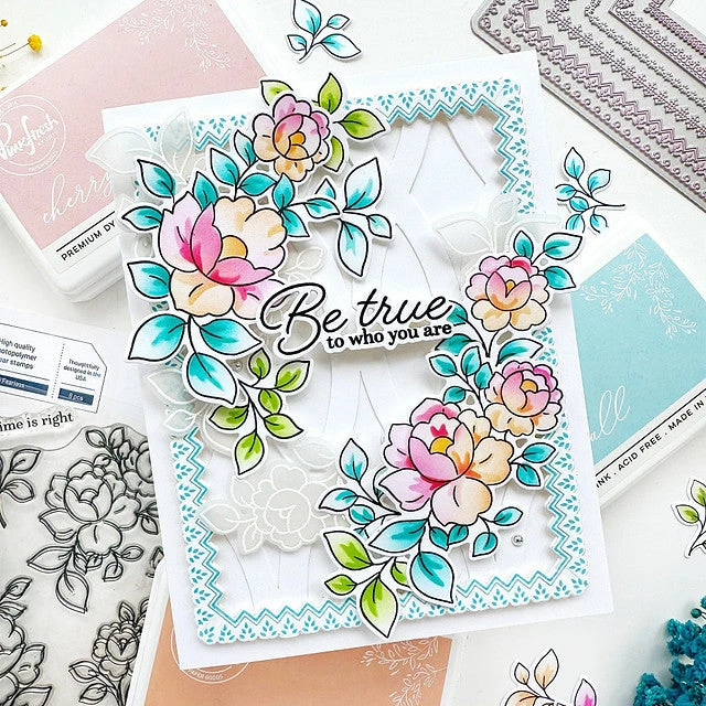 This set of stamps, designed by Inna Moreva, is perfect for coordinating with the 3-piece Be Fearless die set (242724) and 5-piece Be Fearless layering stencil set (242824). It also has a corresponding 3.75 x 4.75 Be Fearless press plate (242824), available for purchase together in this bundle. The lovely posy clusters add a whimsical touch to any papercrafting project. The clusters of flowers and greenery are combined into one stamp for easy alignment with the layering stencils and die. You can choose to stamp the floral image and then blend in different shades of ink with the stencils, or use your favorite mediums like watercolor, markers, or colored pencils to color in the outline. Pinkfresh Studio’s versatile products offer different options for creating unique designs.