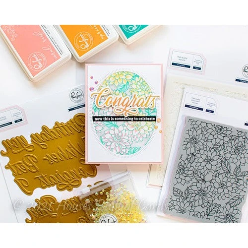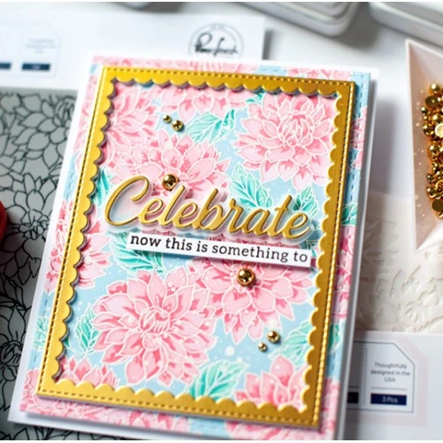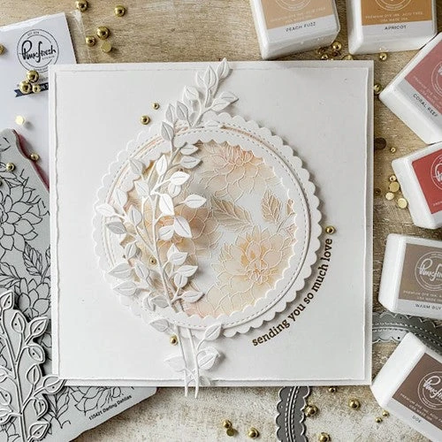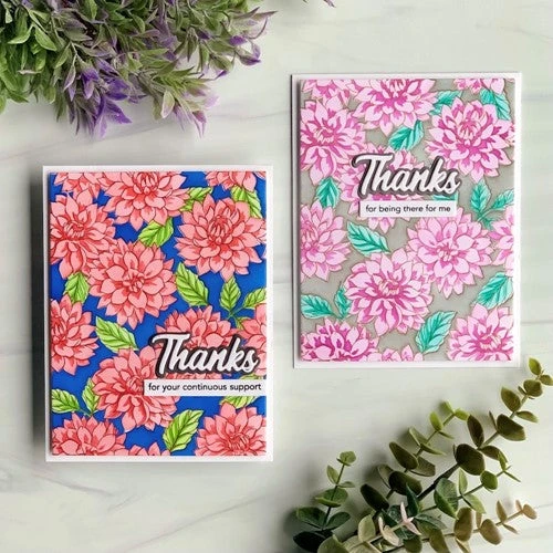 This sweet Dahlia background is perfect for A2 sized cards. The blooms and leaves are perfect for all types of coloring; including watercolor, alcohol and brush markers, colored pencils and no-line coloring. Combine with the coordinating Darling Dahlias layering stencil set to ink blend the images with all 48 shades of PinkFresh’s premium dye inks. This full background image pairs perfectly with many of PinkFresh Studio Essentials dies to give it that nice finished edge.