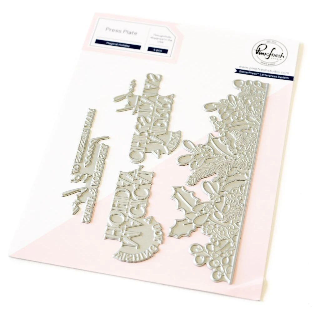 Indulge in luxury with Pinkfresh Studio’s 4-piece press plate set designed by Inna Moreva, a perfect complement to the exclusive Magical Holiday stencil (251824), die (251724), and stamp sets (251624). Elevate your papercrafting and stationery projects with the high-end feel of LetterPress stationery, created to work seamlessly with the BetterPress LetterPress System from Spellbinders. These press plates can also be used for foiling with your hot foil system, adding a touch of sophistication and versatility to your crafting experience.