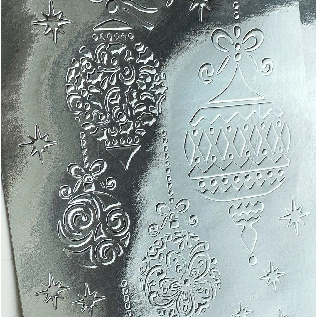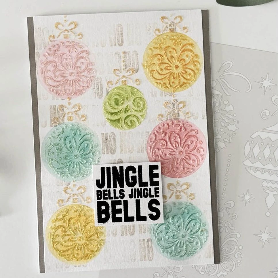 Polkadoodles Beautiful Baubles Emboss-Ink Stencil, part of the Frosted Christmas Collection, features five intricately detailed hanging baubles with star accents—perfect for adding festive charm to your holiday projects. Made from thicker mylar, this 6 x 8-inch stencil is ideal for embossing with a die-cutting machine and embossing mat, producing crisp, raised designs. Use it with inks or Stencil Butter Frosting to add stunning dimension and texture to cards, tags, and mixed media creations.