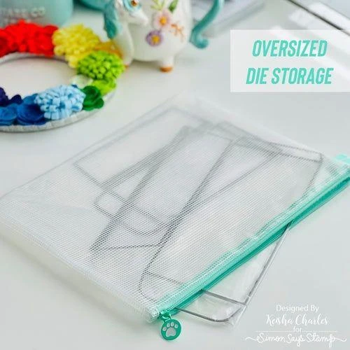 Our Simon Says Stamp Mesh Bags are a pawsitively perfect storage solution for all your crafty supplies and are the best quality available! The large 10 x 12.5 inch size allows for full-sized 8.5 x 11 inch paper sheets to fit inside. The flexible makeup of this bag also gives room for bulkier items such as jars or tools. The mesh material has a slick coating, which makes for easy clean-up if you put inky brushes into it. Not just for your craft room, our Mesh Bags are even great for traveling; place your favorite supplies inside and carry them with you for on-the-go crafty time!Â