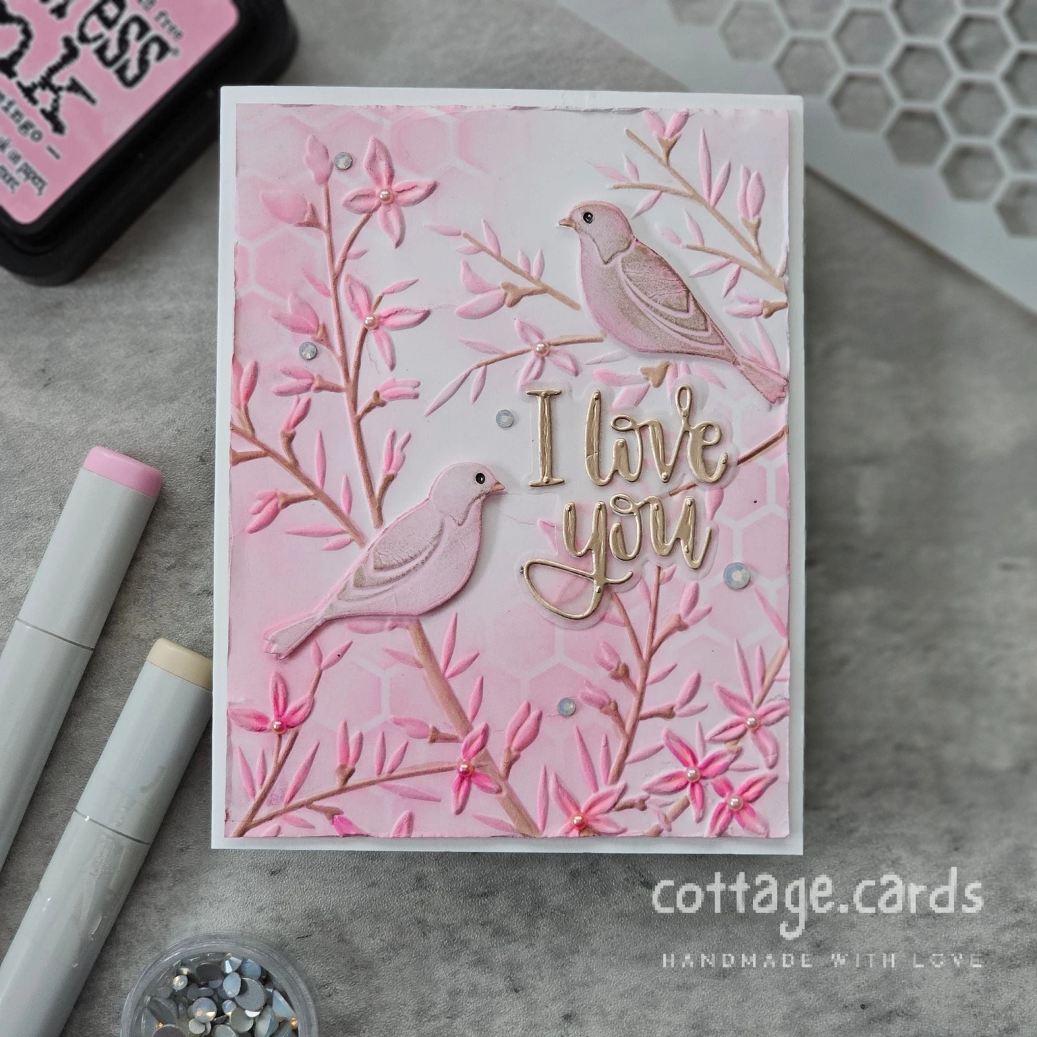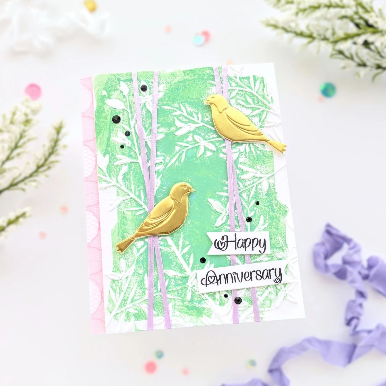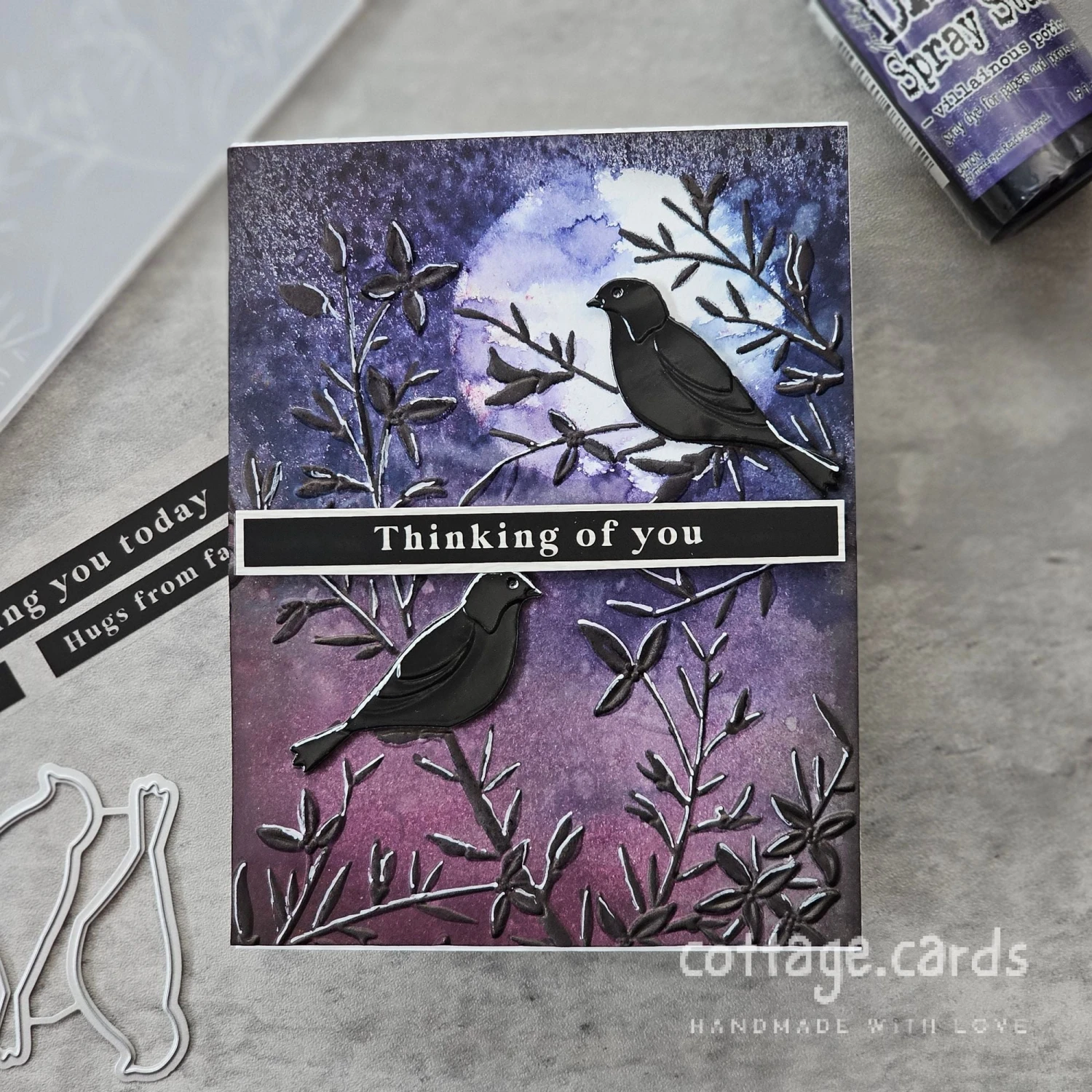 The Simon Says Stamp Bold Bird Branches embossing folder creates a charming scene of leafy branches with two small birds nestled among the foliage. Coordinating dies cut out or pop up the birds, adding dimension and focus to your creations. (We recommend die cutting first to avoid flattening the embossing.)