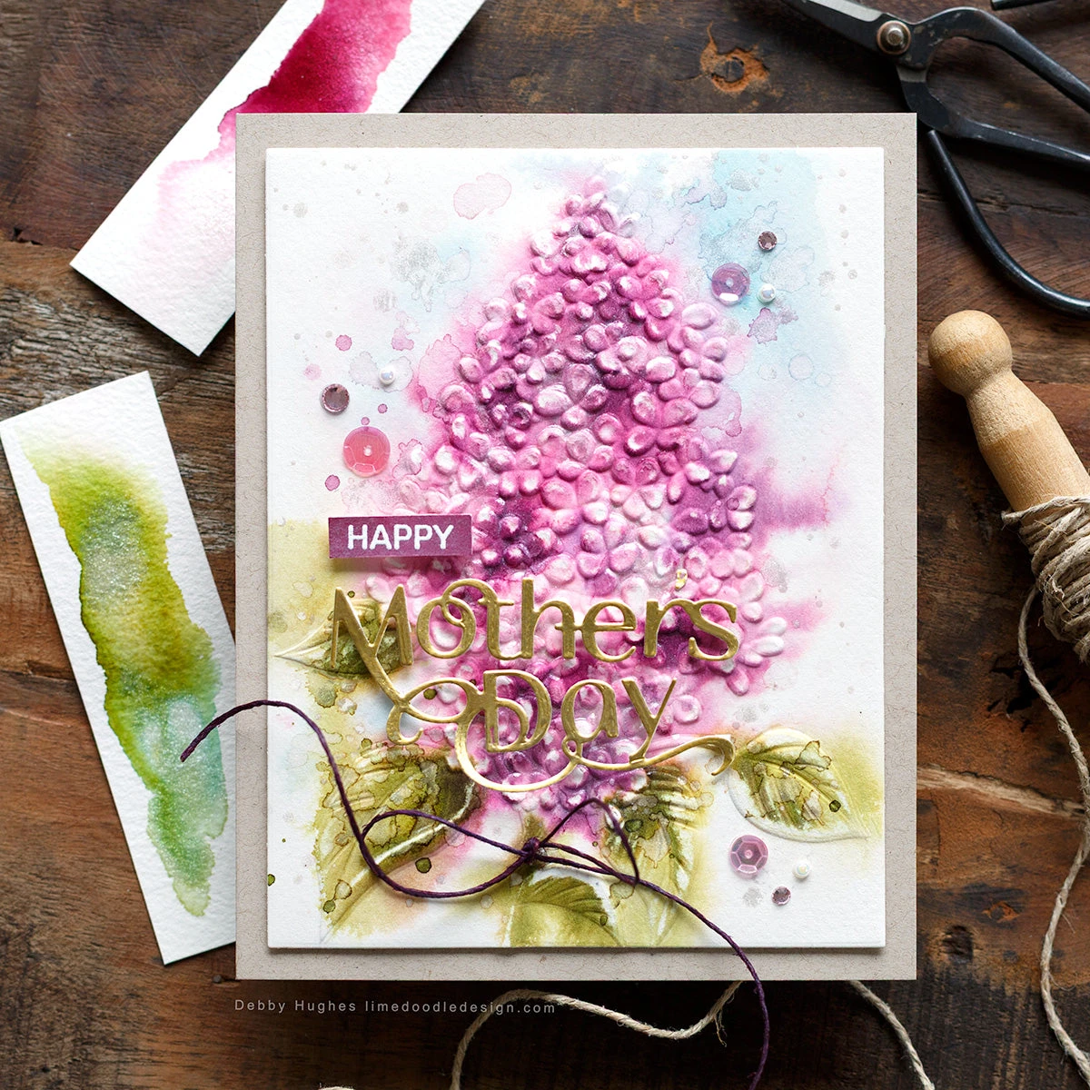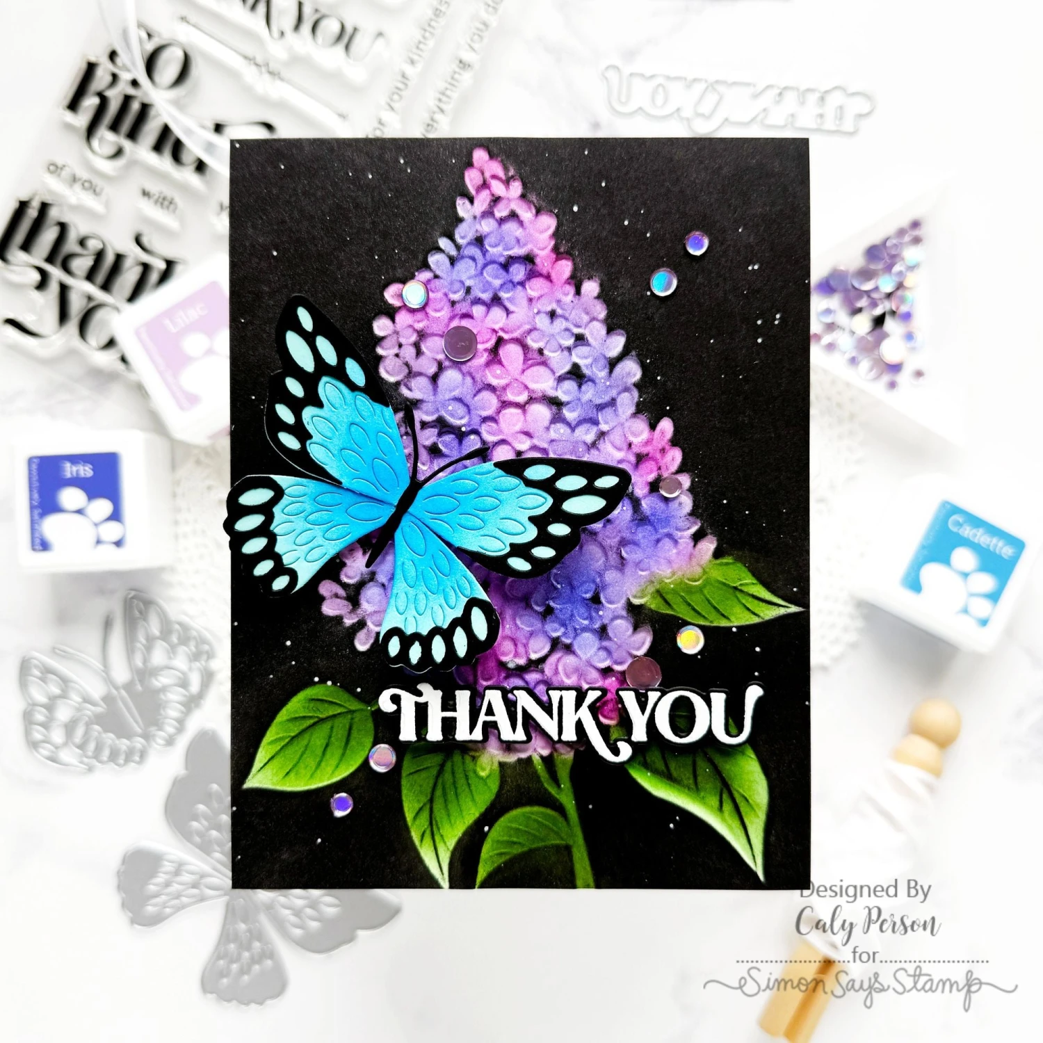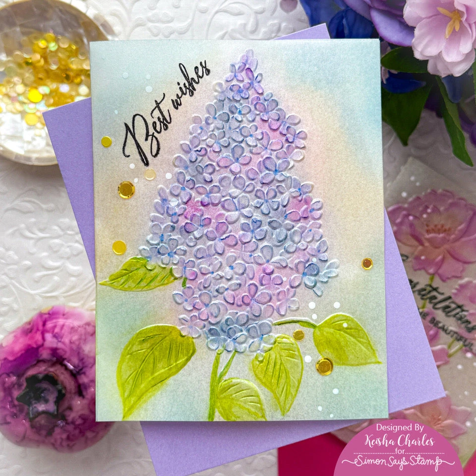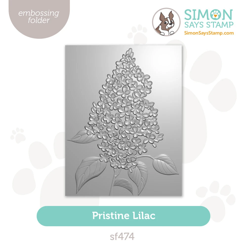 The Simon Says Stamp Pristine Lilac embossing folder creates a stunning, textured impression of a large, detailed lilac sprig.