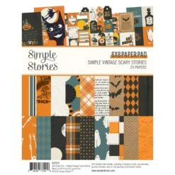 The Simple Stories Vintage Scary Stories 6×8 inch Paper Pad contains 24 double-sided sheets, including 4 designer prints and (2) 3×4 inch greeting card element sheets. These high-quality printed designer cardstock papers are perfect for a variety of uses such as scrapbooking, paper crafting, card making, planning, and home decor. The designs feature spooky imagery including bats, skeletons, jack-o-lanterns, witch hats, and spiderwebs in shades of orange, black, white, brown, yellow, and blue.