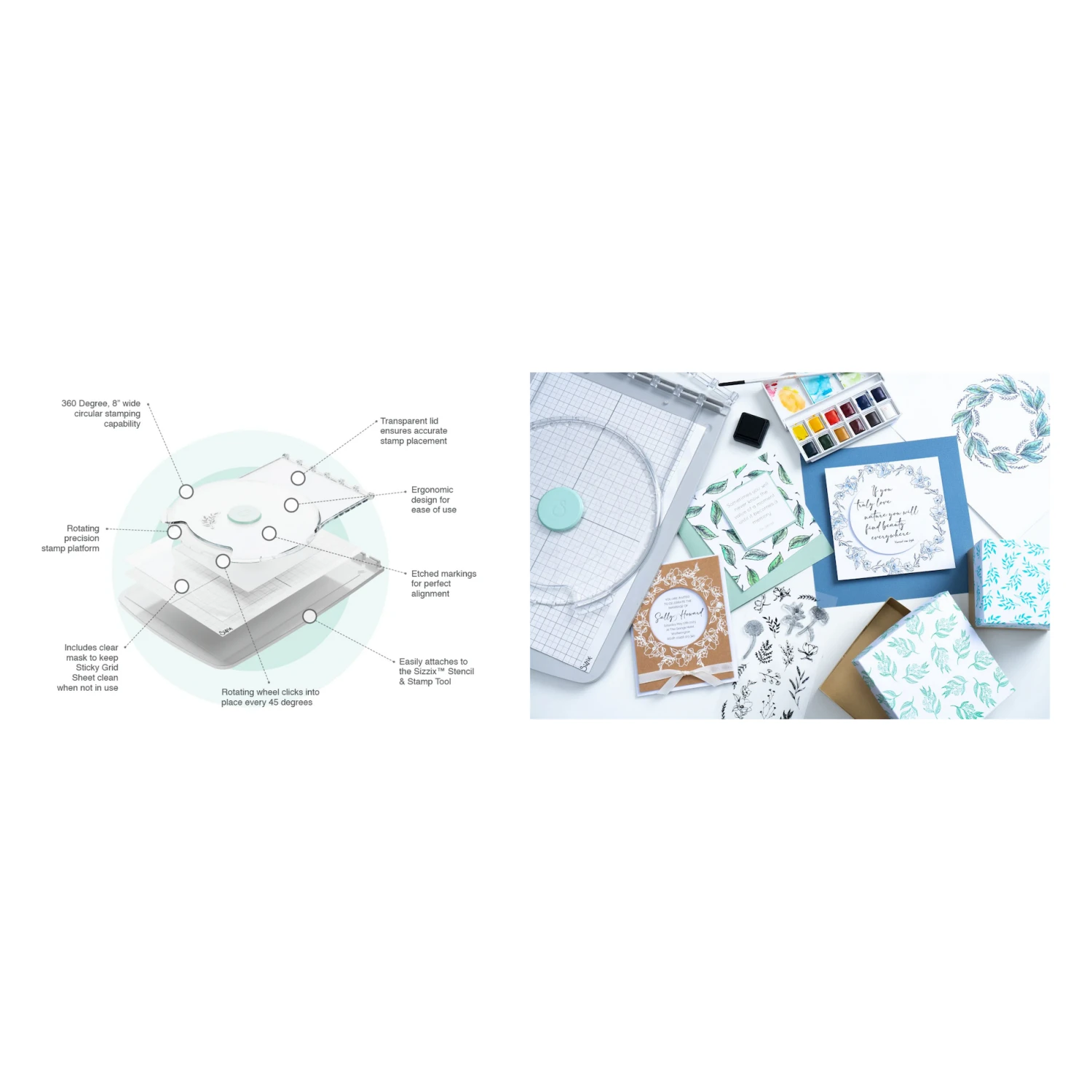 The Sizzix Stamp & Spin Accessory has been seamlessly designed as an addition to the Sizzix Stencil & Stamp Tool (664896), giving makers the ability to create continuous circular stamped designs. The Sizzix Stencil & Stamp Tool gives consumers everything they need to create beautiful papercrafts, ensuring layering stencils and stamps are in perfect position and have perfect precision. With the Stamp and Spin Accessory, it’s never been easier to create your own circular stamped designs to create wreaths, as well as all-over patterns!